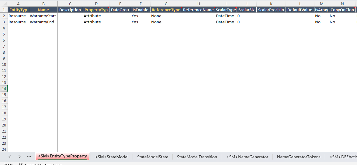 If you want to add specific attributes to an entity, you must create the attribute in the EntityTypeProperty sheet and then add the columns with the attribute names in the target Entity.