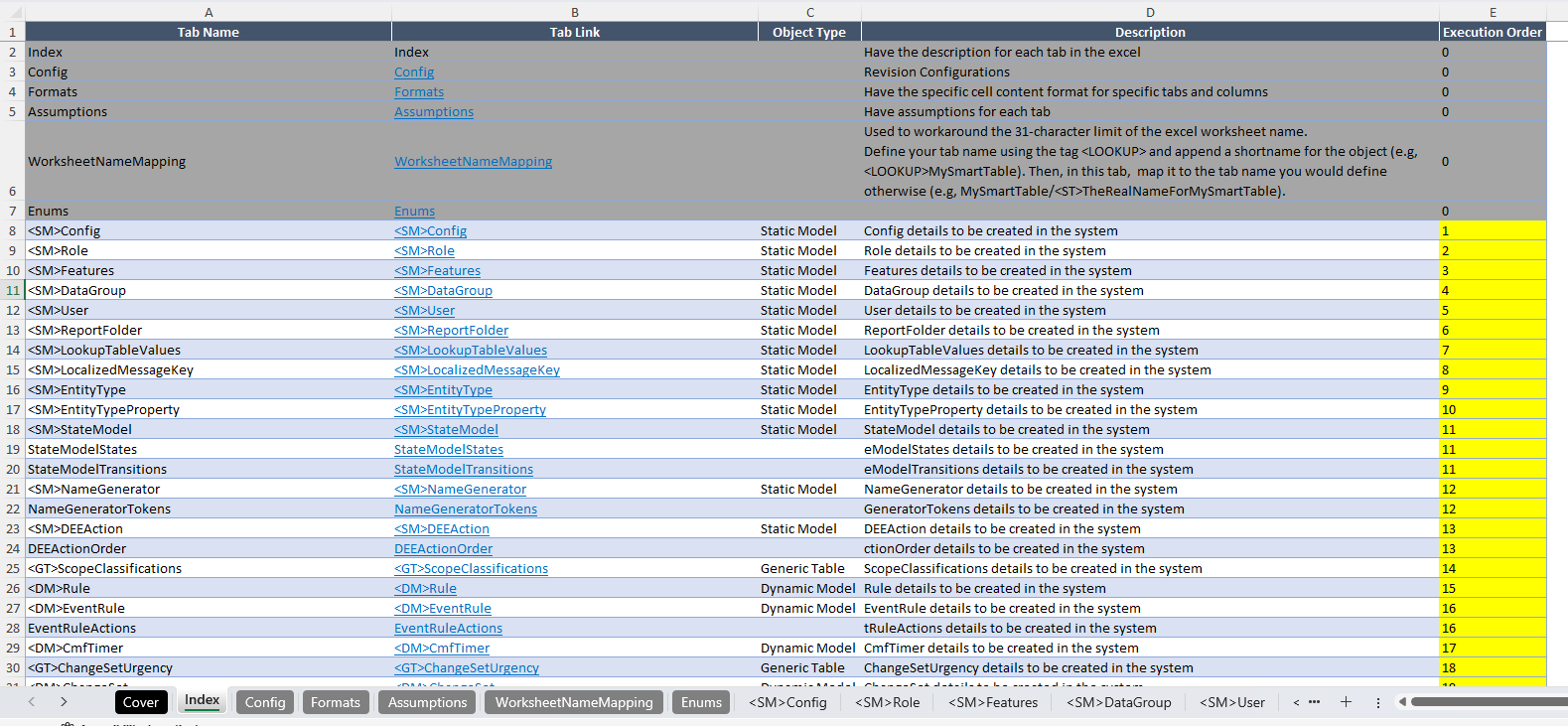 A list of the default sheets in the document, its object type, a brief description and the execution order of each file tab. All these fields are just informative.