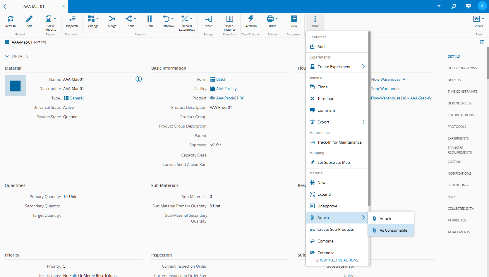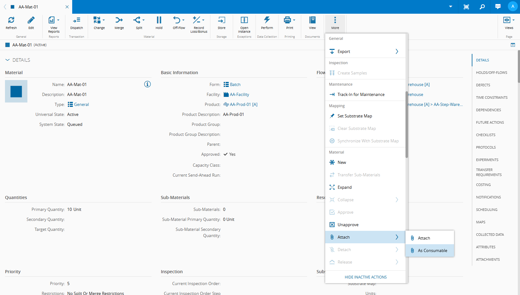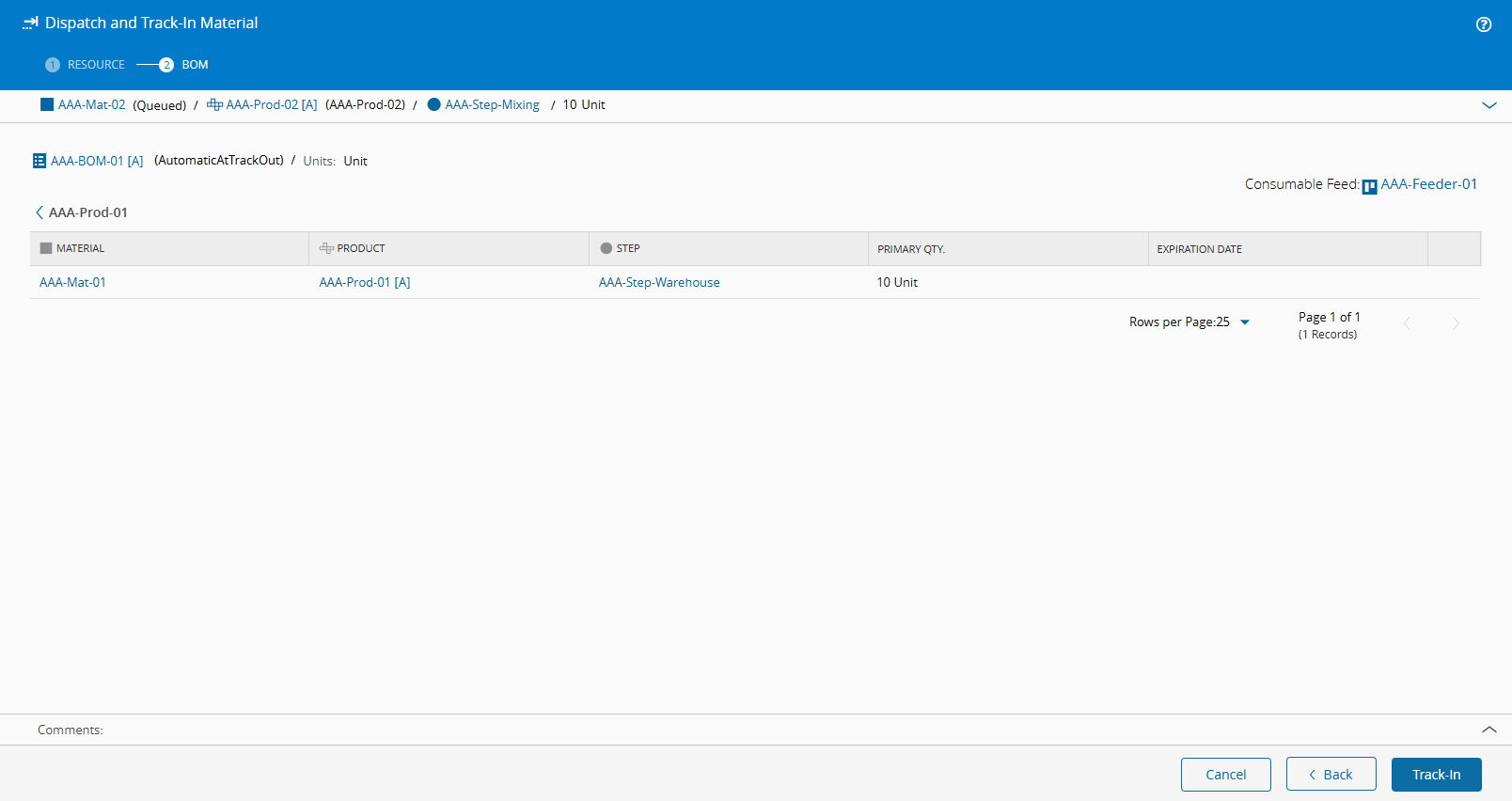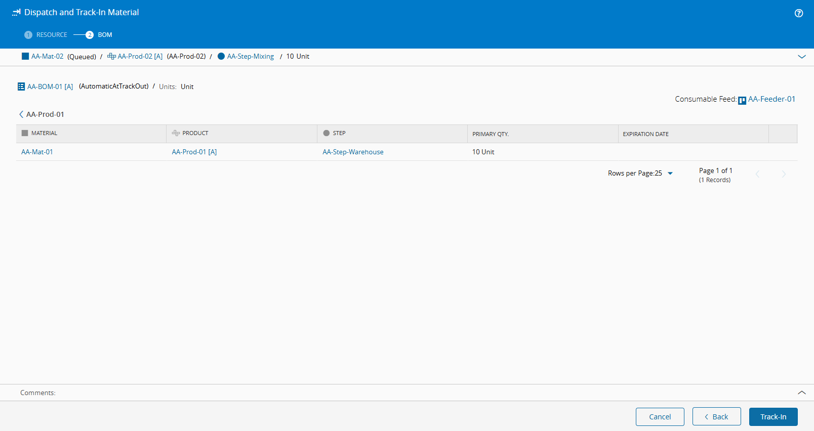 You can now Dispatch and Track-In your main Material and verify the BOM information: