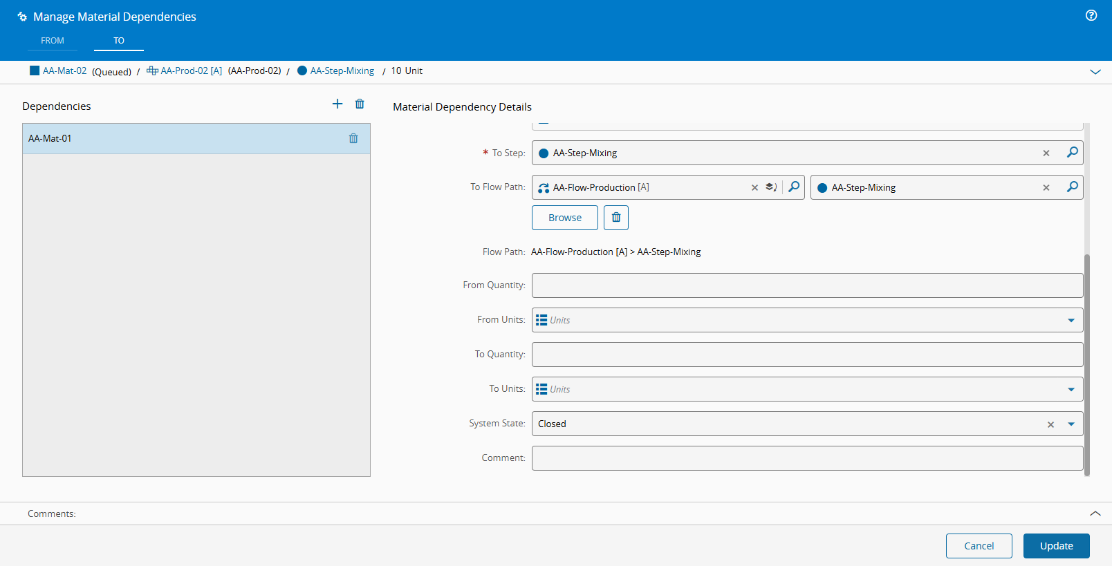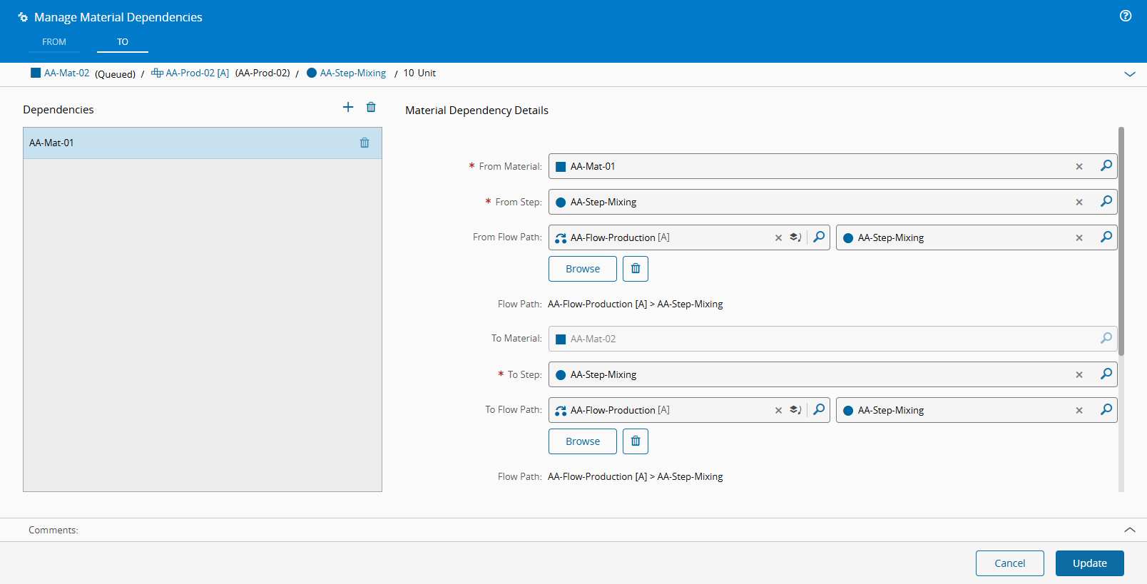 If you select Material Dependency for the Material Reservation Mode, but do not create a Dependency for the Material you want to produce, the system will return an error. In the example below, the AA-Mat-02 is the Material that is being produced, and it depends on AA-Mat-01 to provide it with its raw materials. As this Dependency was not created, the system will not allow you continue, and explains just that in the error message:
