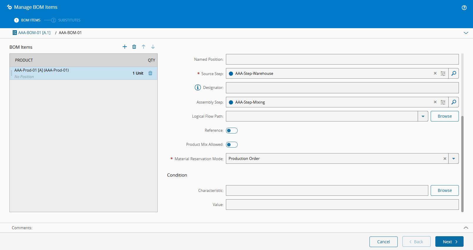 When you are working with BOMs, and their Scope is Durables, Materials, Packing, or Weigh And Dispense, you will have to define whether the BOM Products include Material Reservations, and how Material Reservations are handled for the BOM Items.