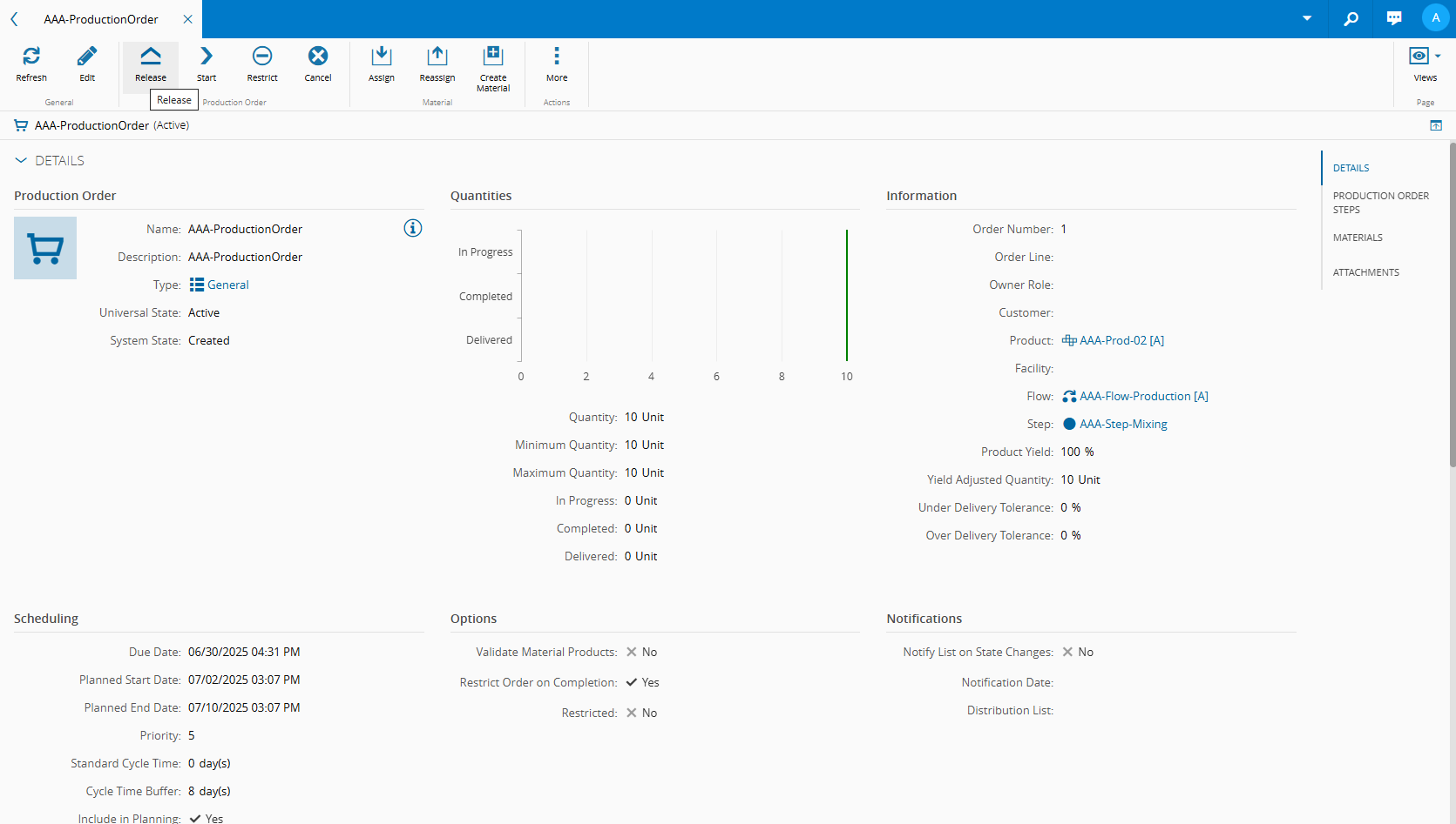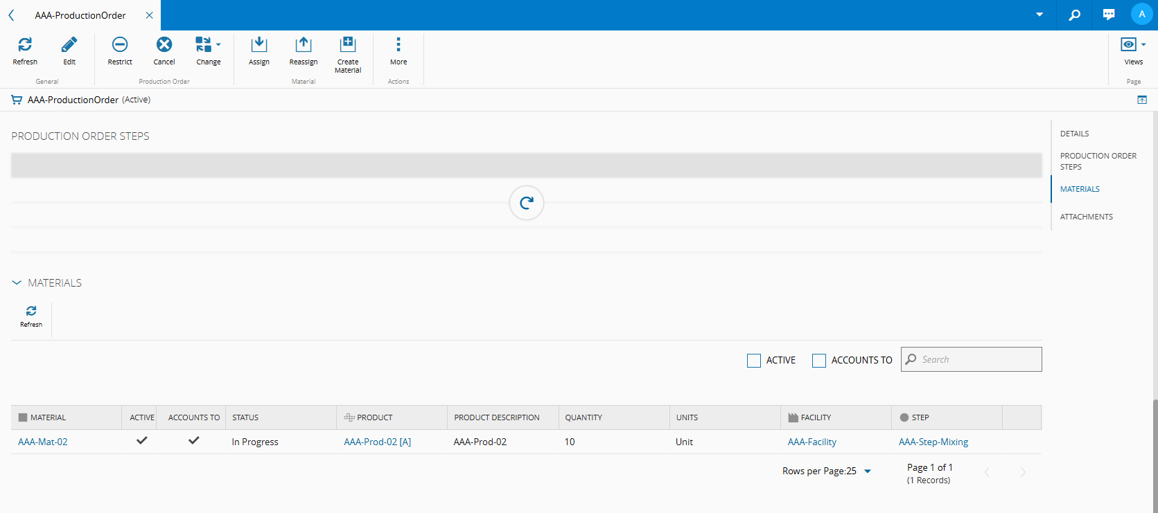 At this point, you can see your consumption Material and production information in the Materials section of your Production Order: