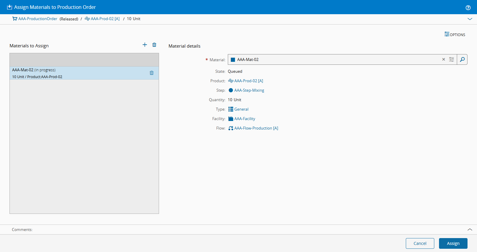 Select Assign and your Production Order will have the main Material assigned to it: