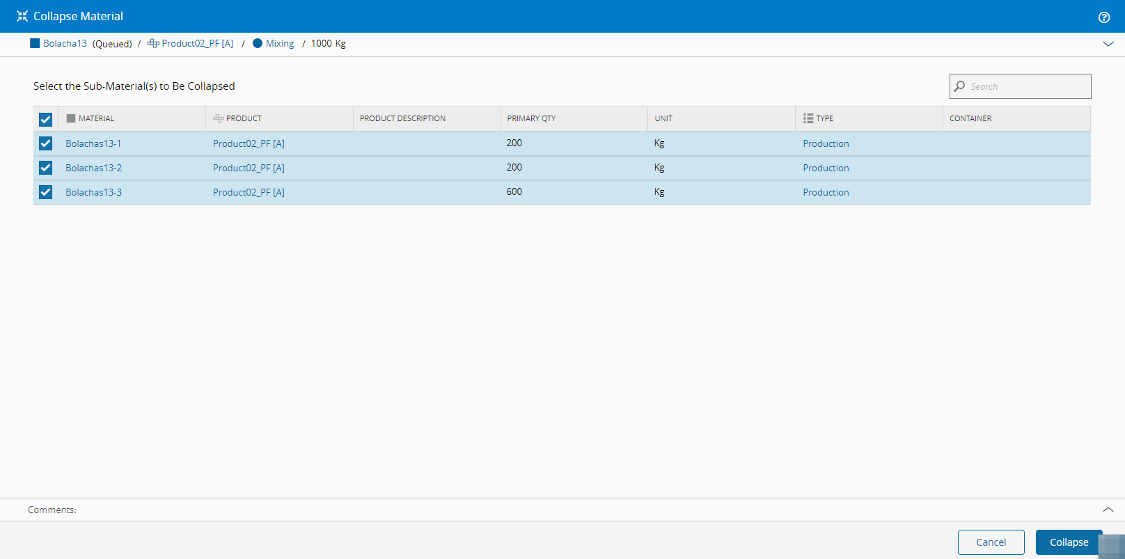 For more information, see Collapse Material - Critical Manufacturing Documentation Portal ⧉