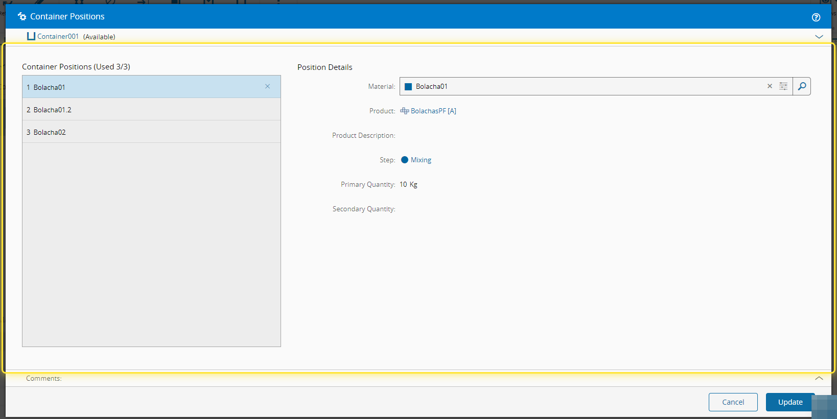 For more information, see Manage Container Positions - Critical Manufacturing Documentation Portal ⧉