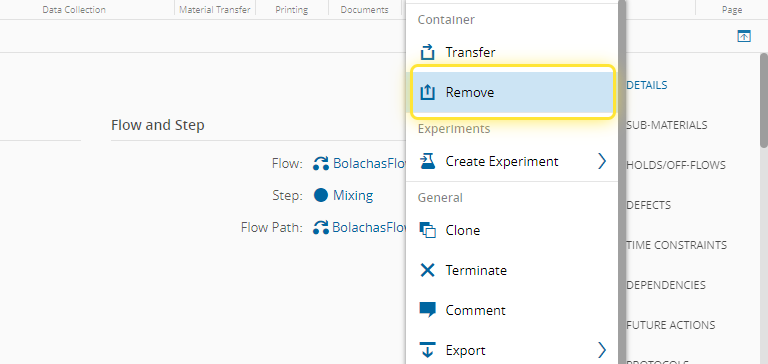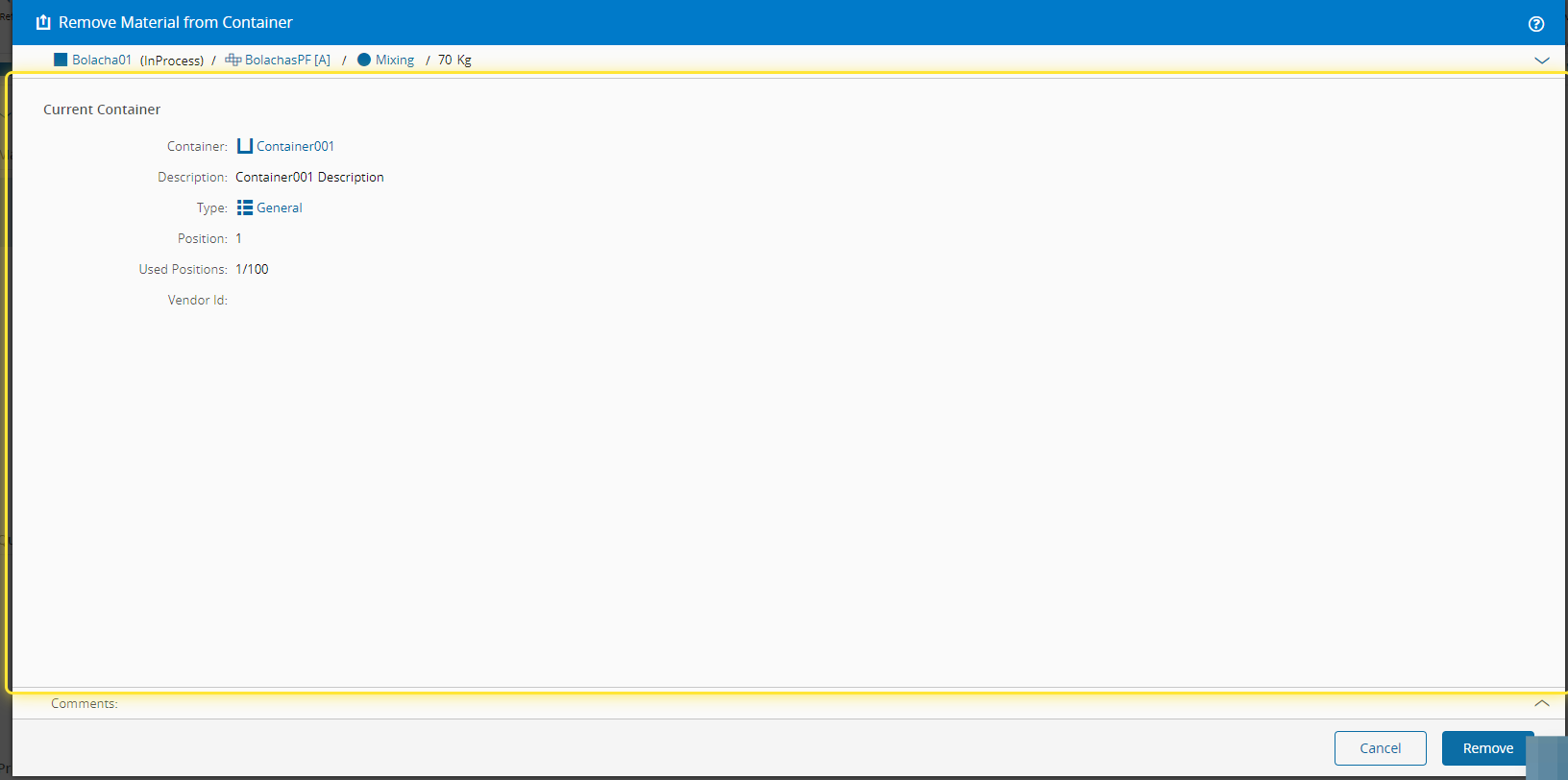 For more information, see Remove Material from Container - Critical Manufacturing Documentation Portal ⧉