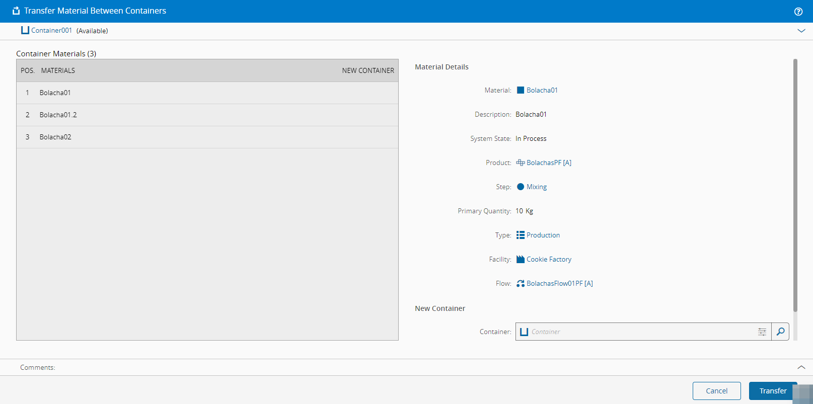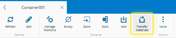 For more information, see Transfer Material Between Containers - Critical Manufacturing Documentation Portal ⧉