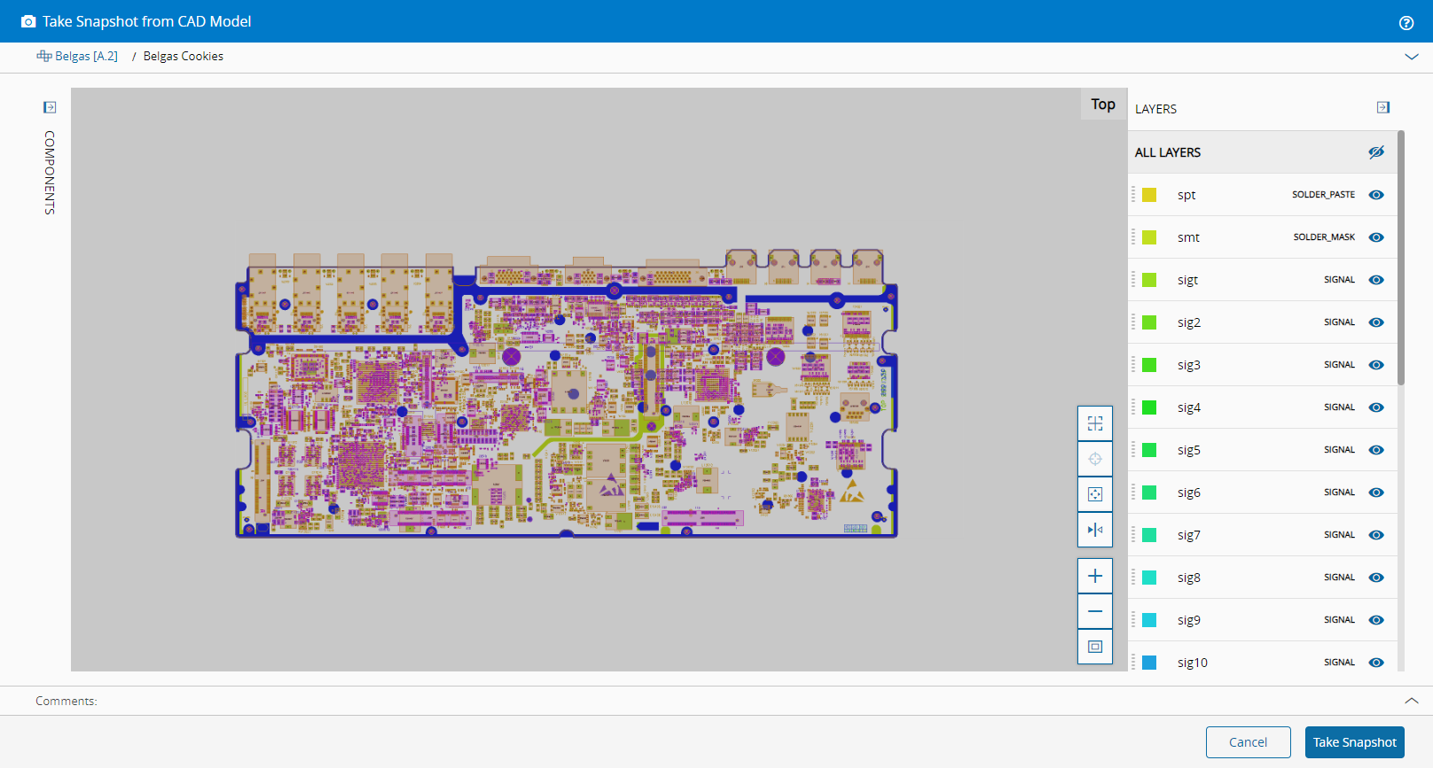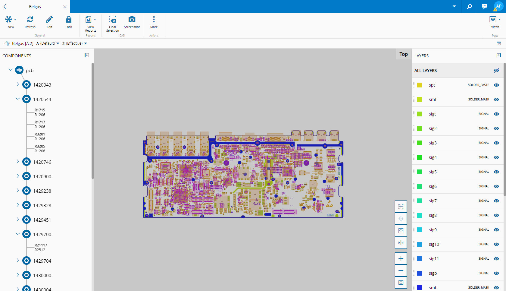 On the right-hand side of the screen it possible to show/hide layers. On the left-hand side of the screen, it is displayed the Product tree, with the Product Components and Reference Designators and it is also possible to select a Reference Designator that will be highlighted in the CAD drawing. By double-clicking on a Reference Designator in the CAD drawing, the Reference Designator name will be highlighted in the Product tree.