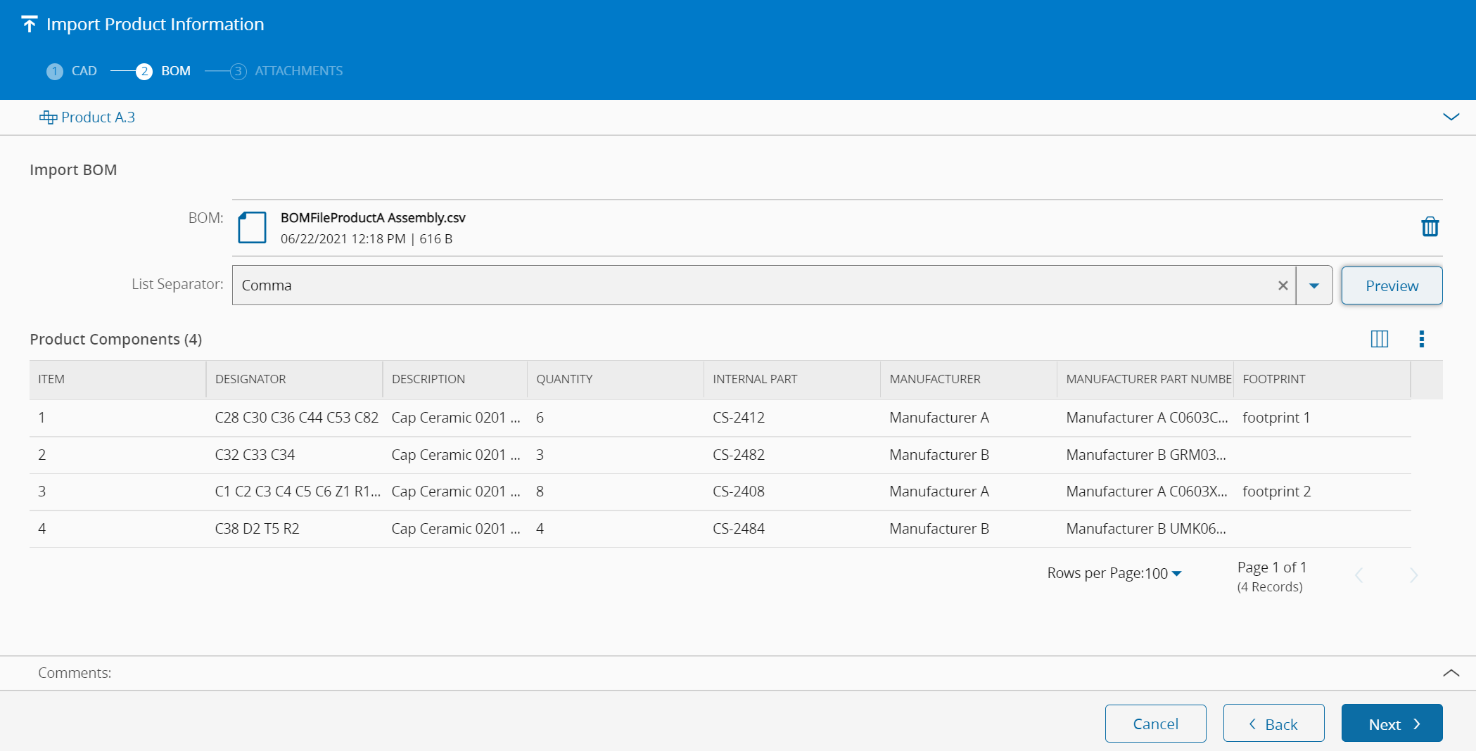 If the User selects a BOM file, the Product Components can be previewed by selecting the Preview button, as displayed in the Figure below. For the required structure of the BOM File please check the BOM File Support sub-section below.