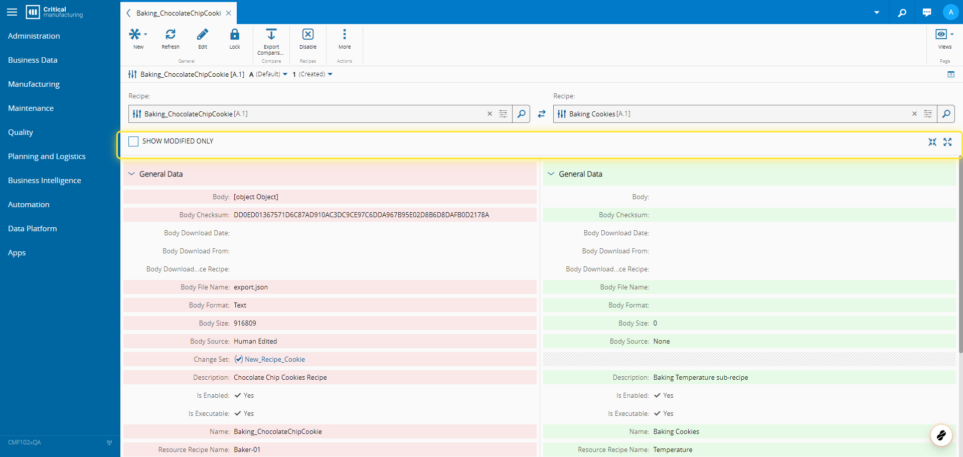 For more information, see Compare Recipes - Critical Manufacturing Documentation Portal ⧉