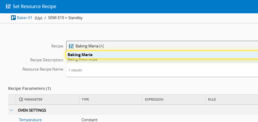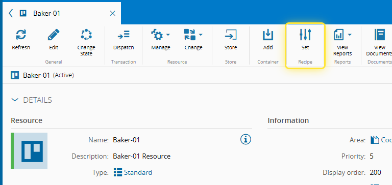 How to Set a Recipe in a Resource# 1. Go to the Business Data menu.# 2. Select the Resource entity.# 3. Select the desired Resource.# 4. Select Set Recipe.# 5. Search the available Recipes.# 6. Select the desired Recipe.# 7. Select Set to save your changes.#