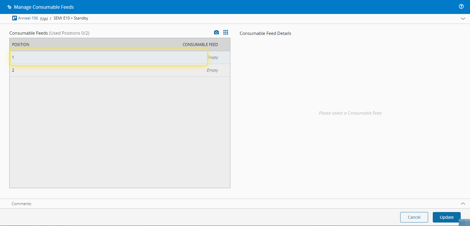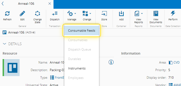 For more information, see Manage Consumable Feeds - Critical Manufacturing Documentation Portal ⧉