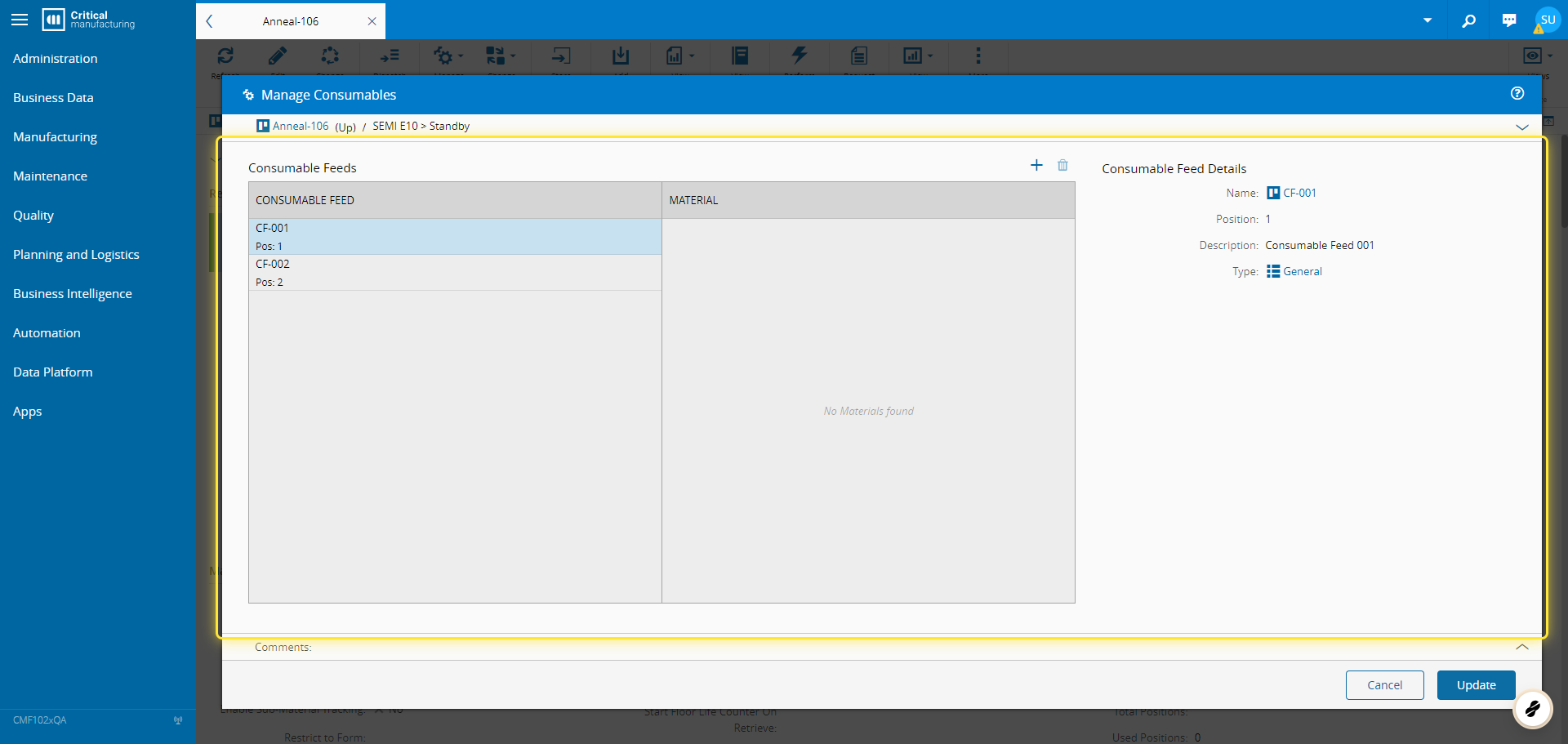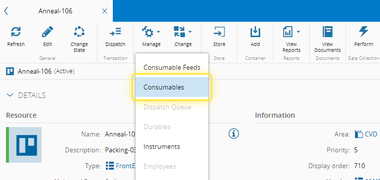 For more information, see Manage Consumables - Critical Manufacturing Documentation Portal ⧉