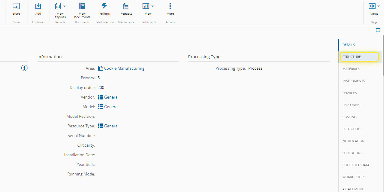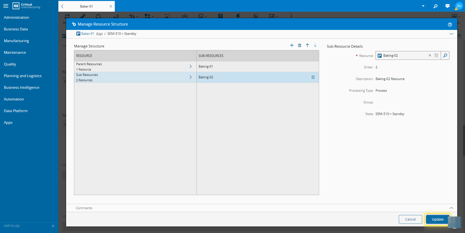 Here you can manage the Parent Resources and Sub-Resources. For more information, see Manage Structure - Critical Manufacturing Documentation Portal ⧉