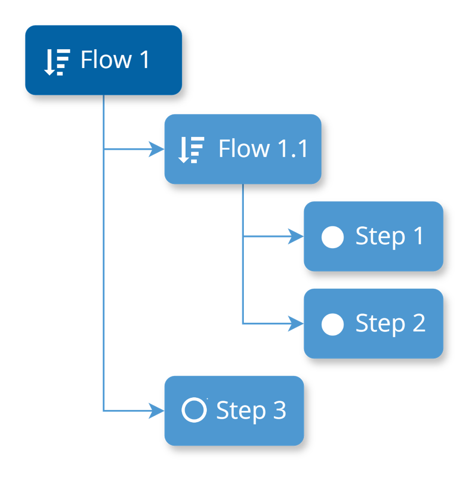 Another possible scenario is displayed below, where Flow 1 is composed of two Flow Items of different types (Flow 1.1 and Step 3), while Flow 1.1 is comprised of two Flow Items of type Step (Step 1 and 2).