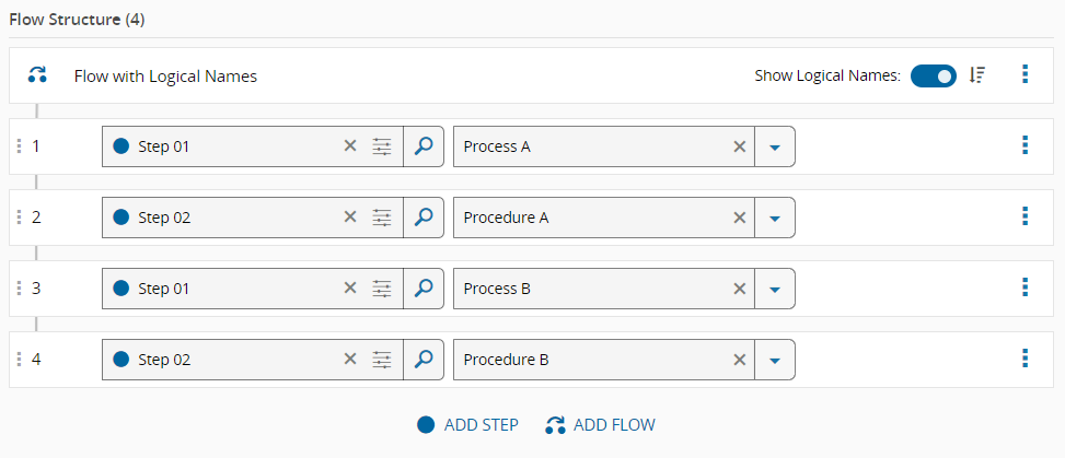 The Logical Name feature provides the flexibility to specify the usage, purpose, or intent of a Step when creating the Flow. You can use the same Flow Items with different Logical Names across various Flows, except for Alternate Flows, Non-Sequential Blocks, or Line Flows.