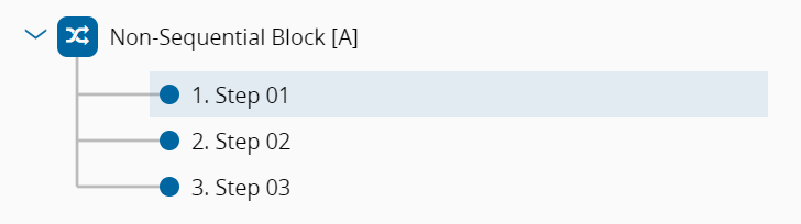 A Non-Sequential Block defines a set of Steps (typically testing/metrology Steps) that need to be performed on a certain Material but for which the order of execution is not relevant. In the example below, the sequences Step 01 – Step 02 – Step 03; Step 02 – Step 01 – Step 03; and Step 03 – Step 01 – Step 02; are all valid sequences for the Material.