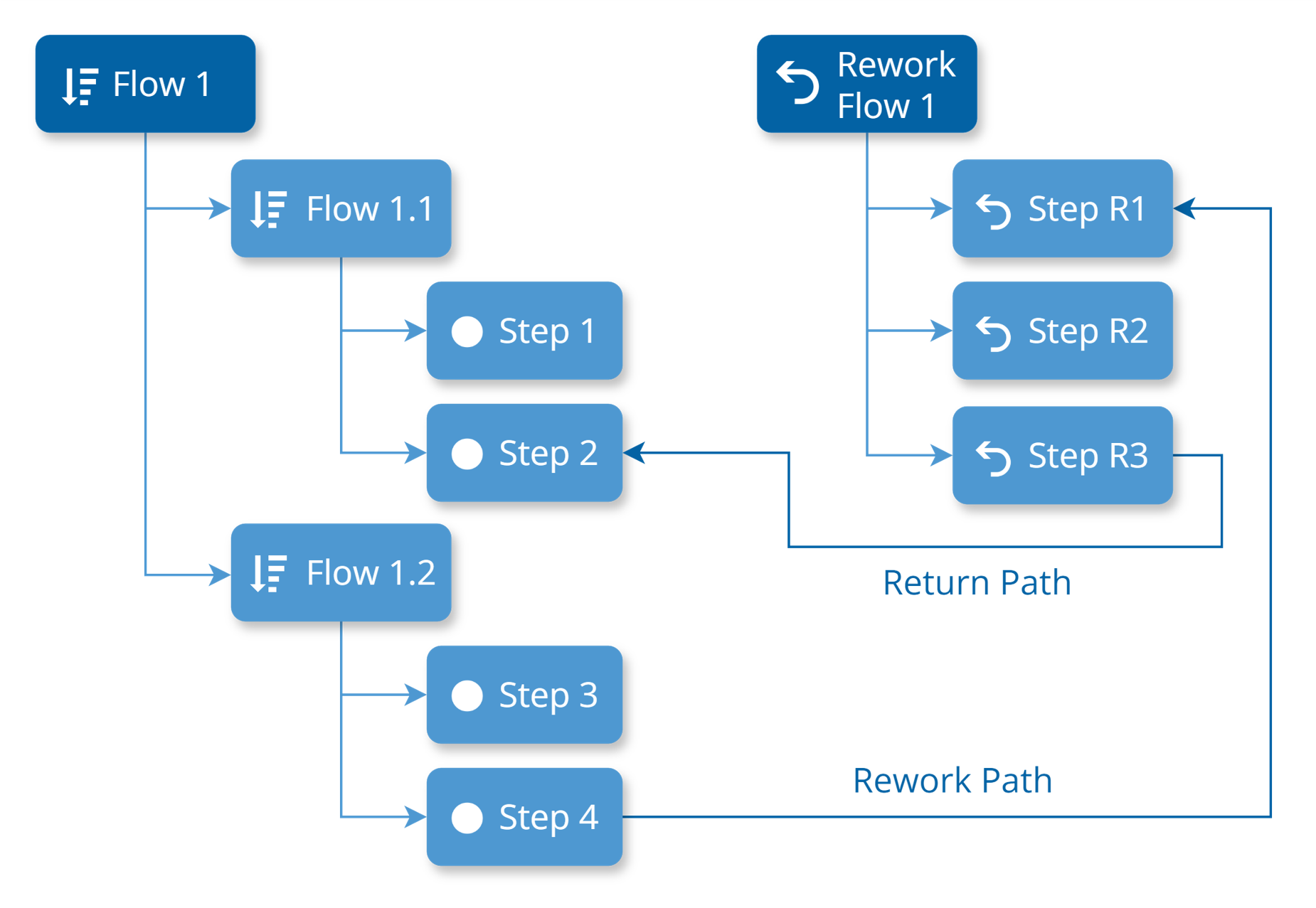Rework Paths can be defined at the Parent Flow level, allowing Return Paths to any Step within its structure. These Return Paths are anchored to the TopMost Flow where they are defined, rather than to a specific Flow Item. For instance, in the diagram below, the Return Path can be any Step (e.g., Step 1, Step 2, Step 3, or Step 4) within the TopMost Flow (Flow 1).