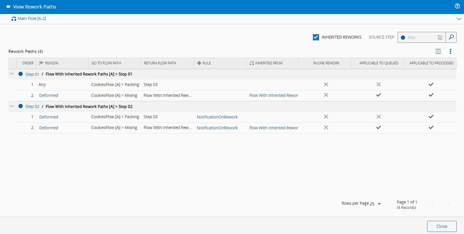In a Flow composed of Steps, it’s possible to define one or more Rework Paths at each Step. A Rework Path can be associated with an Off-Flow Reason linked to the Step, indicating its relevance for Rework, and it establishes both the Go To Flow Path and the Return point within the Flow.