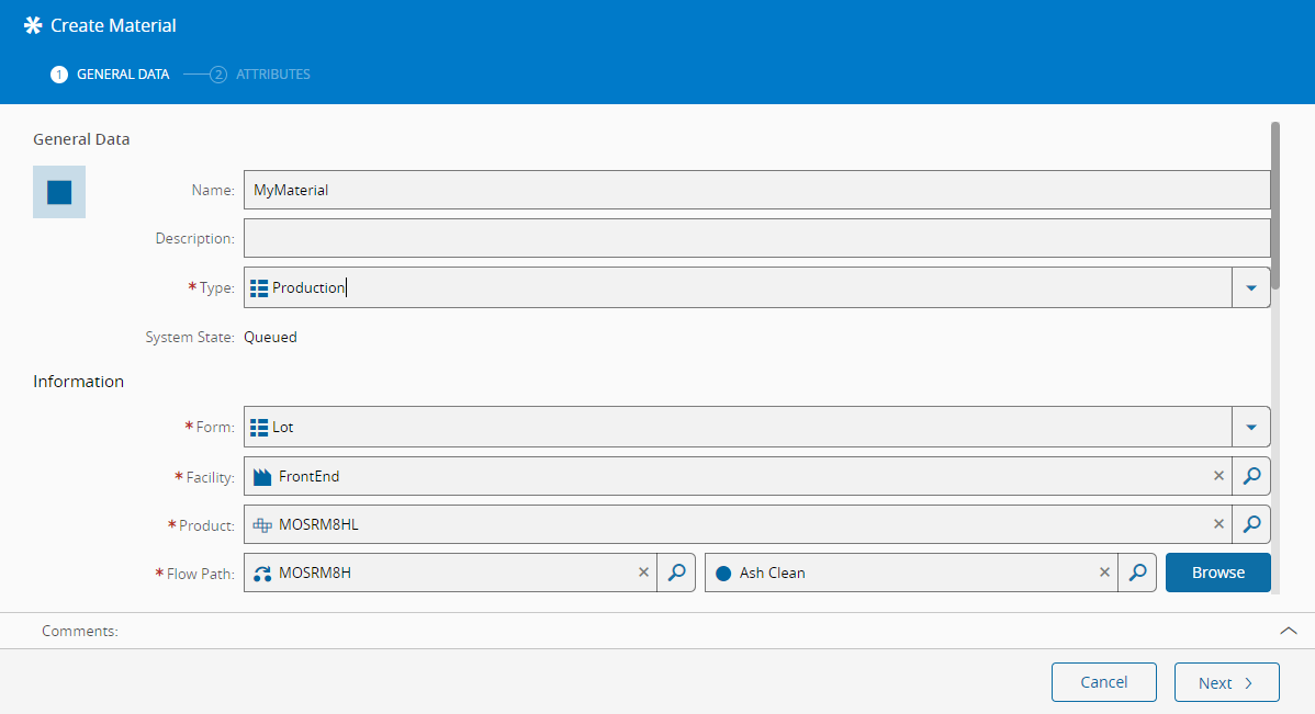 To use a Flow, it’s only necessary to create a Material that references that Flow. Note that if a Product or Product Group define a default Flow Path, the Material will be assigned to that Flow by default when creating the Material. The Material will automatically follow the Flow as defined.