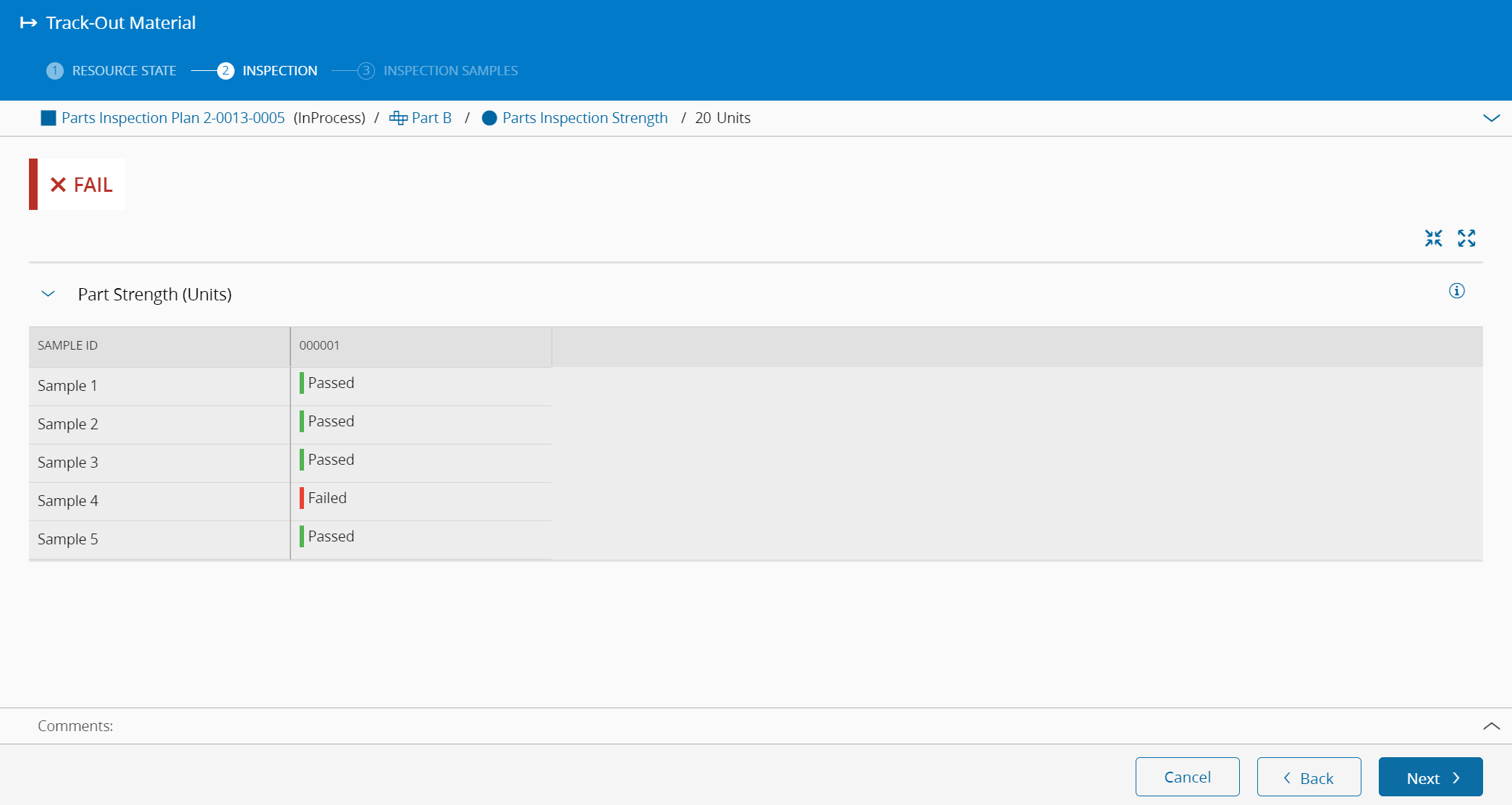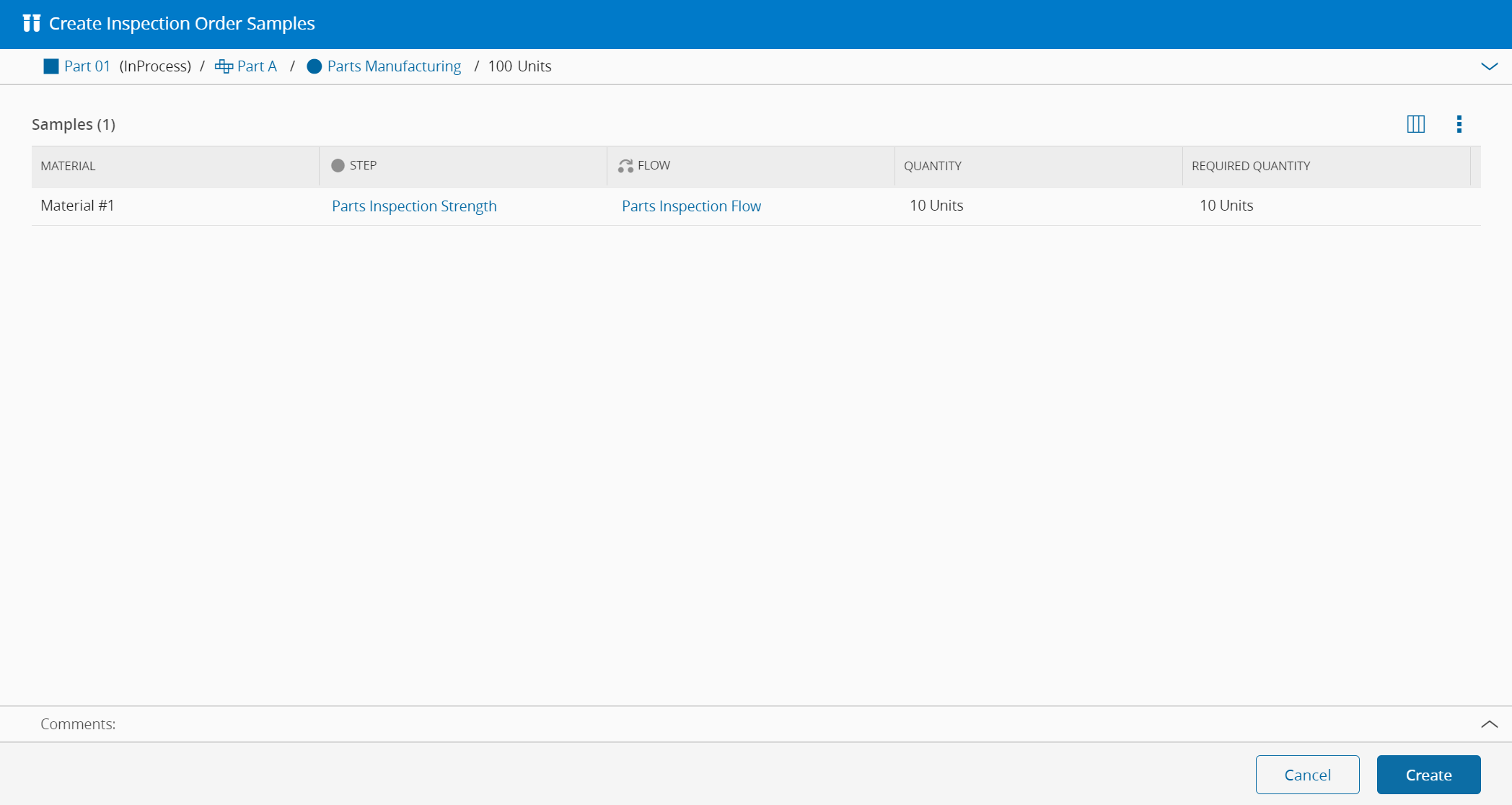 For the given example, you will create samples for Materials that were tracked-in in the Parts Manufacturing Step. The sample will automatically be moved to the Parts Inspection Strength Step, as displayed in the Figure below.