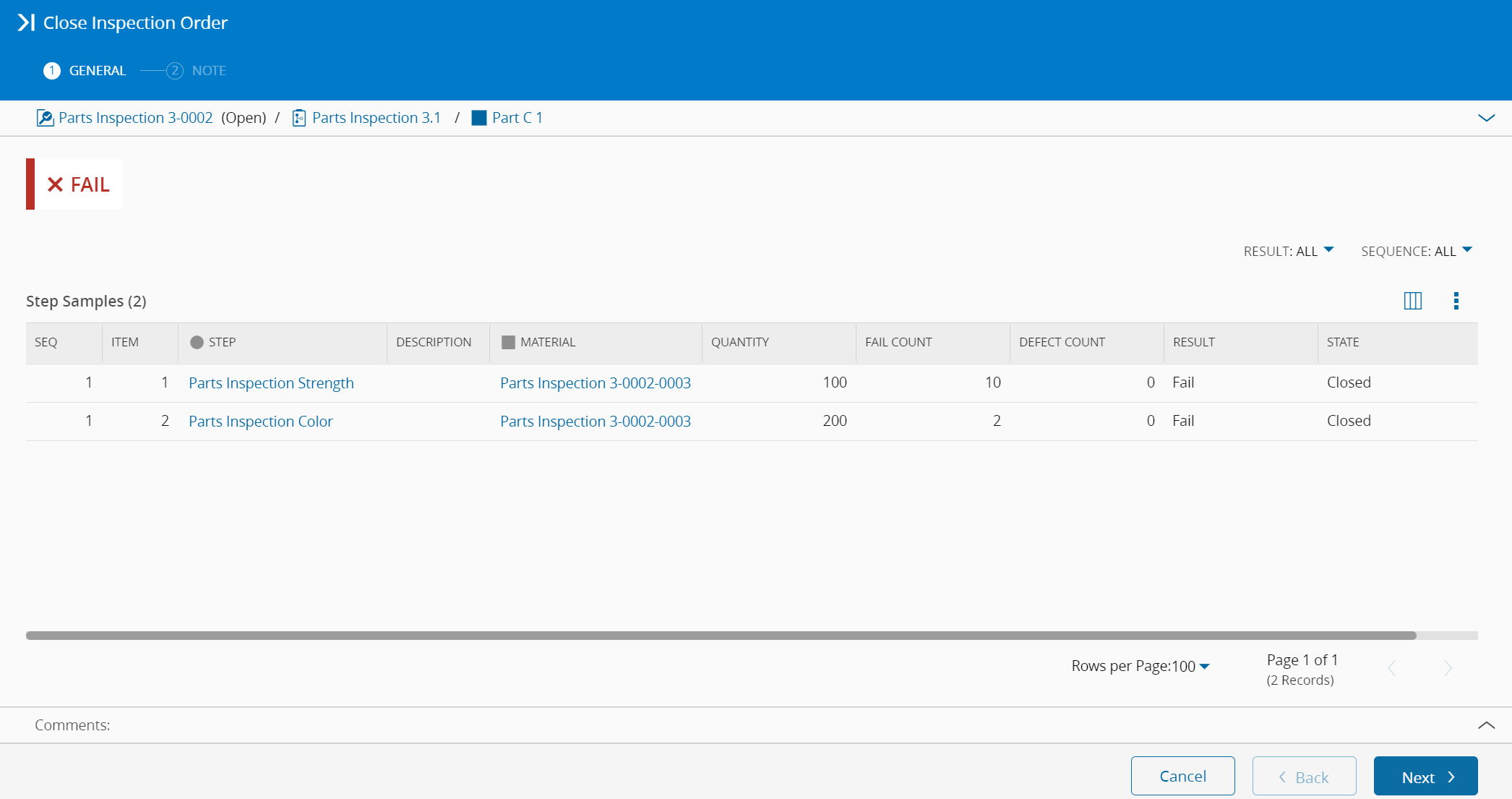 The Inspection Order Step Sample will have the information of the number of Fails (Fail Count) and Defects (Defect Count) identified.