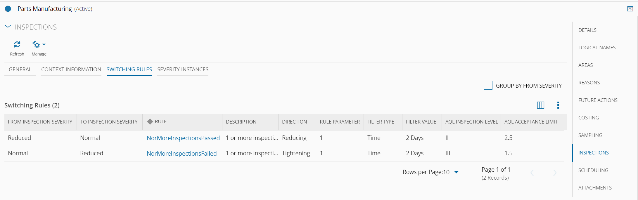 | Severity | Defines the AQL Severity to be used if the selected Inspection Frequency is AQL and if the Inspection Frequency Configuration Mode is Manual. The available values are set in the AQLSeverity Lookup Table. It affects the number of acceptable defects through the Generic Table AQLAcceptanceQualityLimit. The following values are available out-of-the-box: - Normal: Use of a sampling plan with an acceptance criterion that has been devised to secure the producer a high probability of acceptance when the process average of the lot is better than the acceptance quality limit. - Tightened: Use of a sampling plan with an acceptance criterion that is tighter than that for the corresponding plan for normal inspection. - Reduced: Use of a sampling plan with a sample size that is smaller than that for the corresponding plan for normal inspection and with an acceptance criterion that is comparable to that for the corresponding plan for normal inspection. |