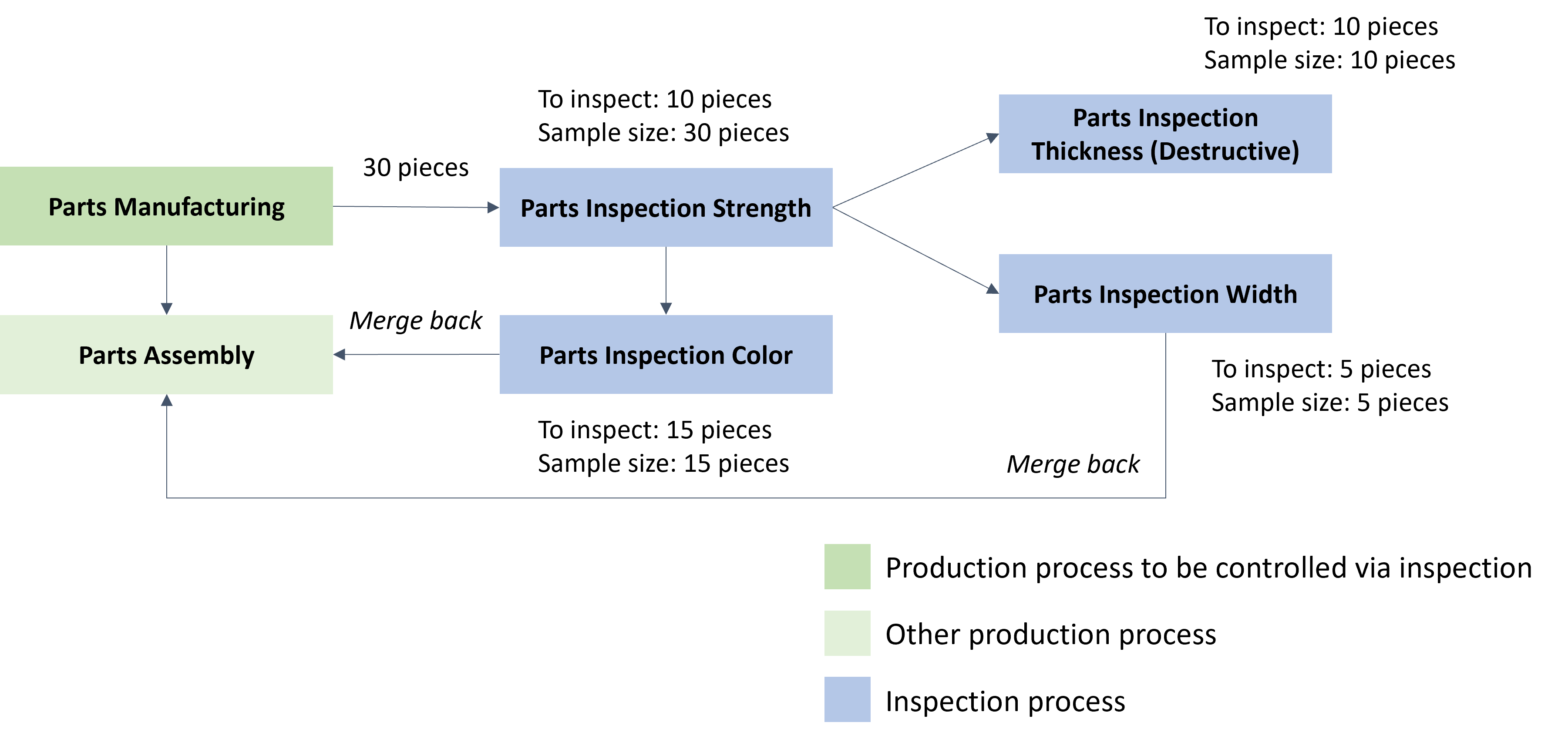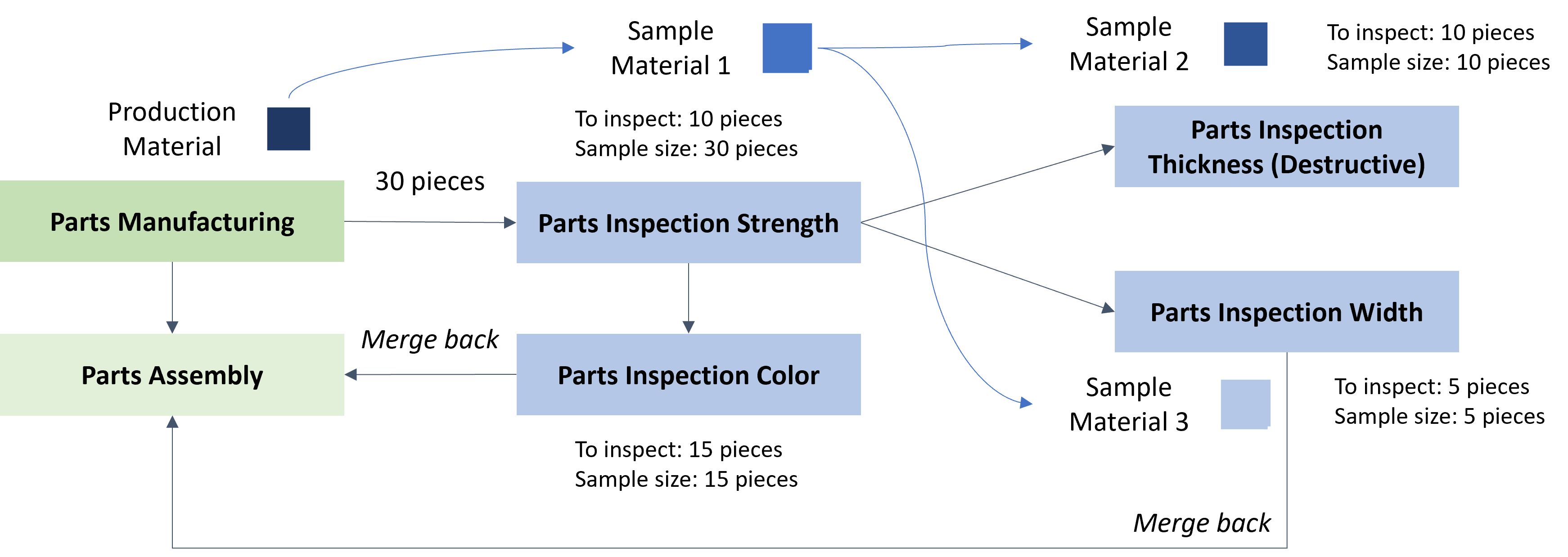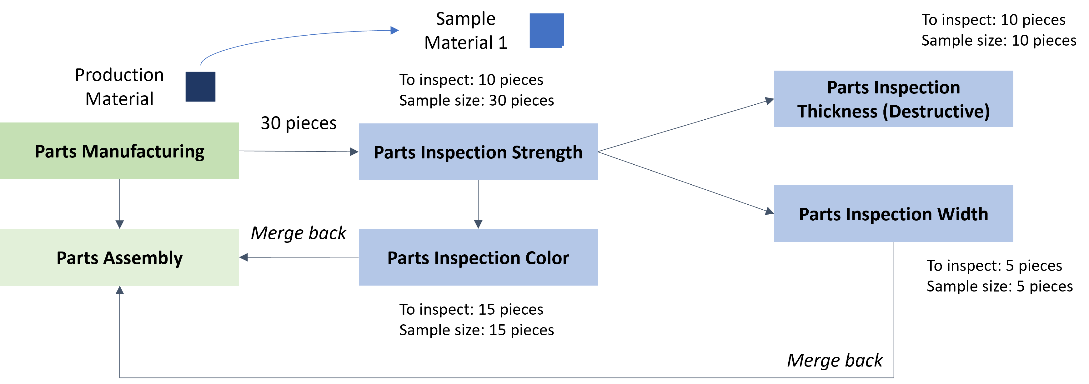 - An Inspection Plan that comprises five inspection Steps: Parts Inspection Strength, Parts Inspection Color, Parts Inspection Width, and Parts Inspection Thickness. The goal of the Inspection Plan is to support the inspection of production Materials which are tracked-in in the Parts Manufacturing Step through five inspection steps. The Samples of the Inspection Steps Parts Inspection Color and Parts Inspection Width are returned to the Production Flow to the Parts Assembly Step. The Sample of the Parts Inspection Thickness Inspection Step is not returned to the Production Flow since it is a destructive test.
