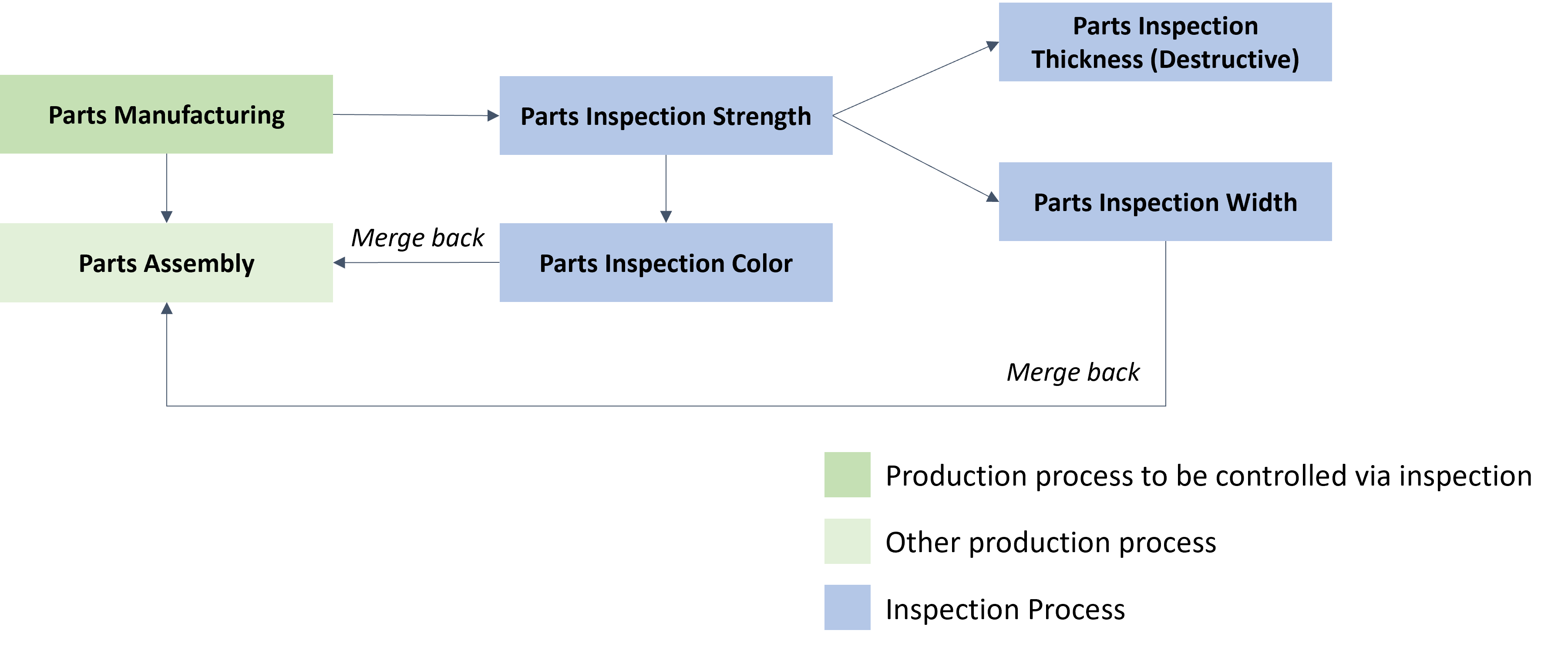 - A production Flow that comprises two production Steps: Parts Manufacturing and Parts Assembly. The Step to be controlled by the inspection is the Parts Manufacturing.