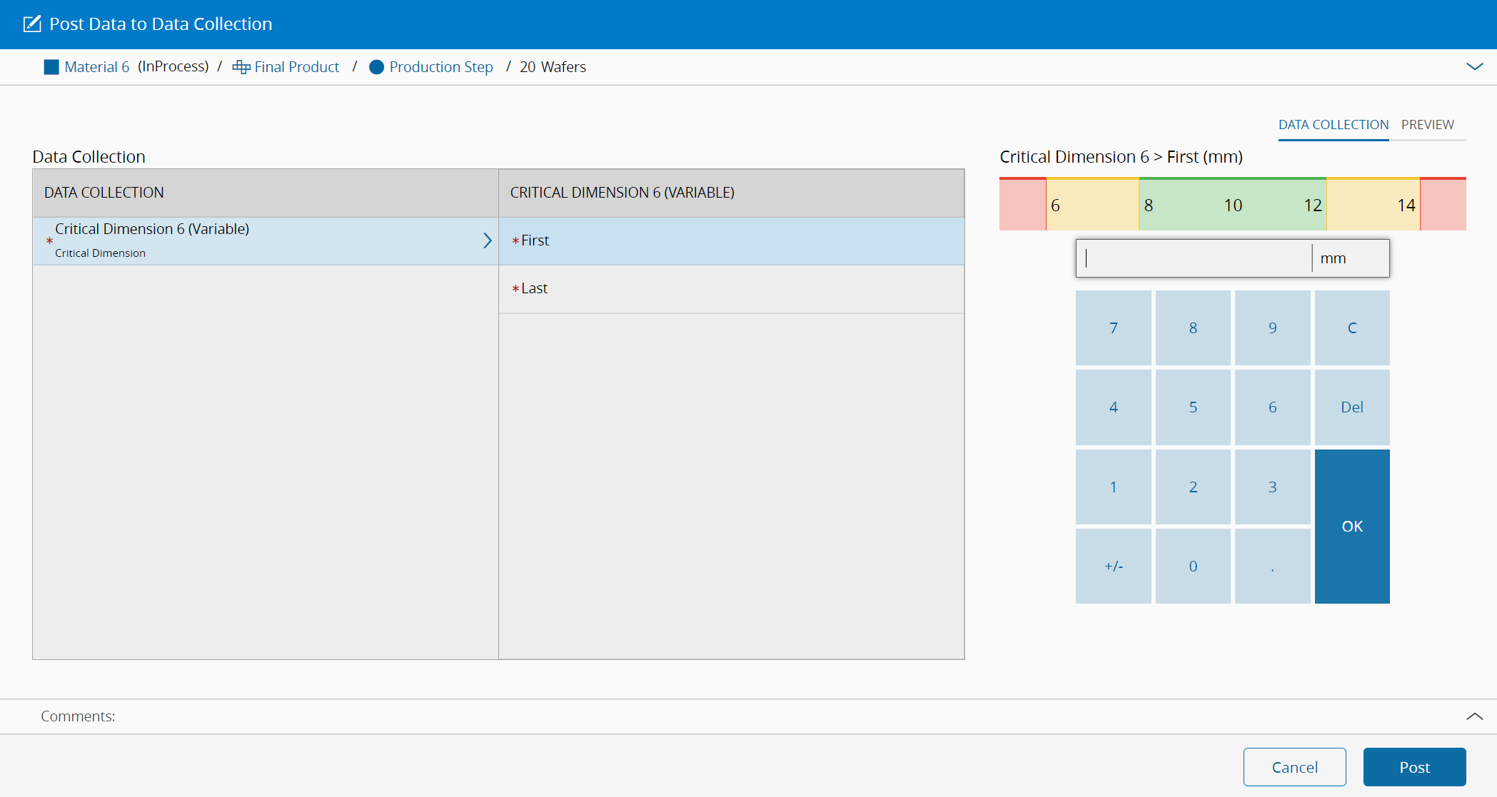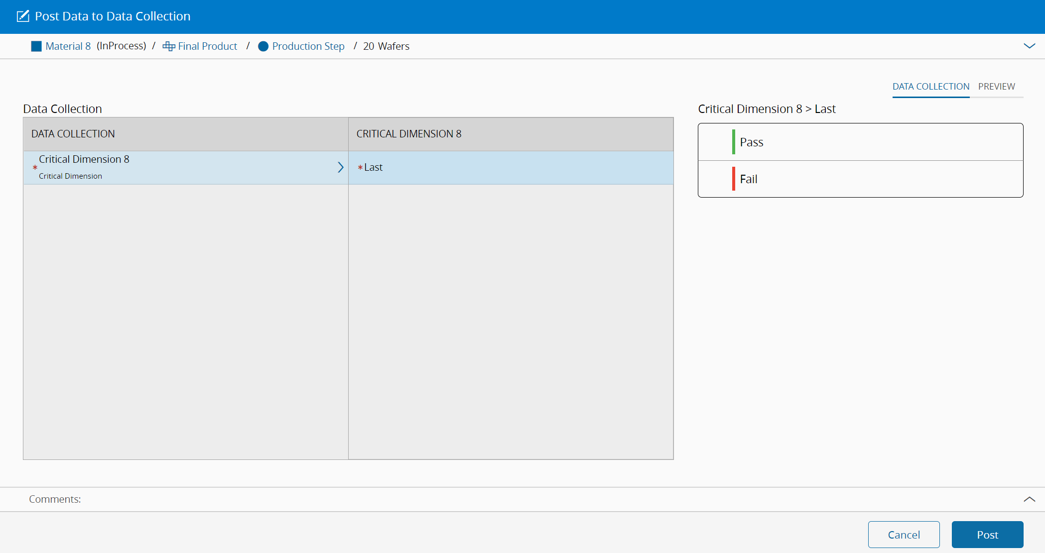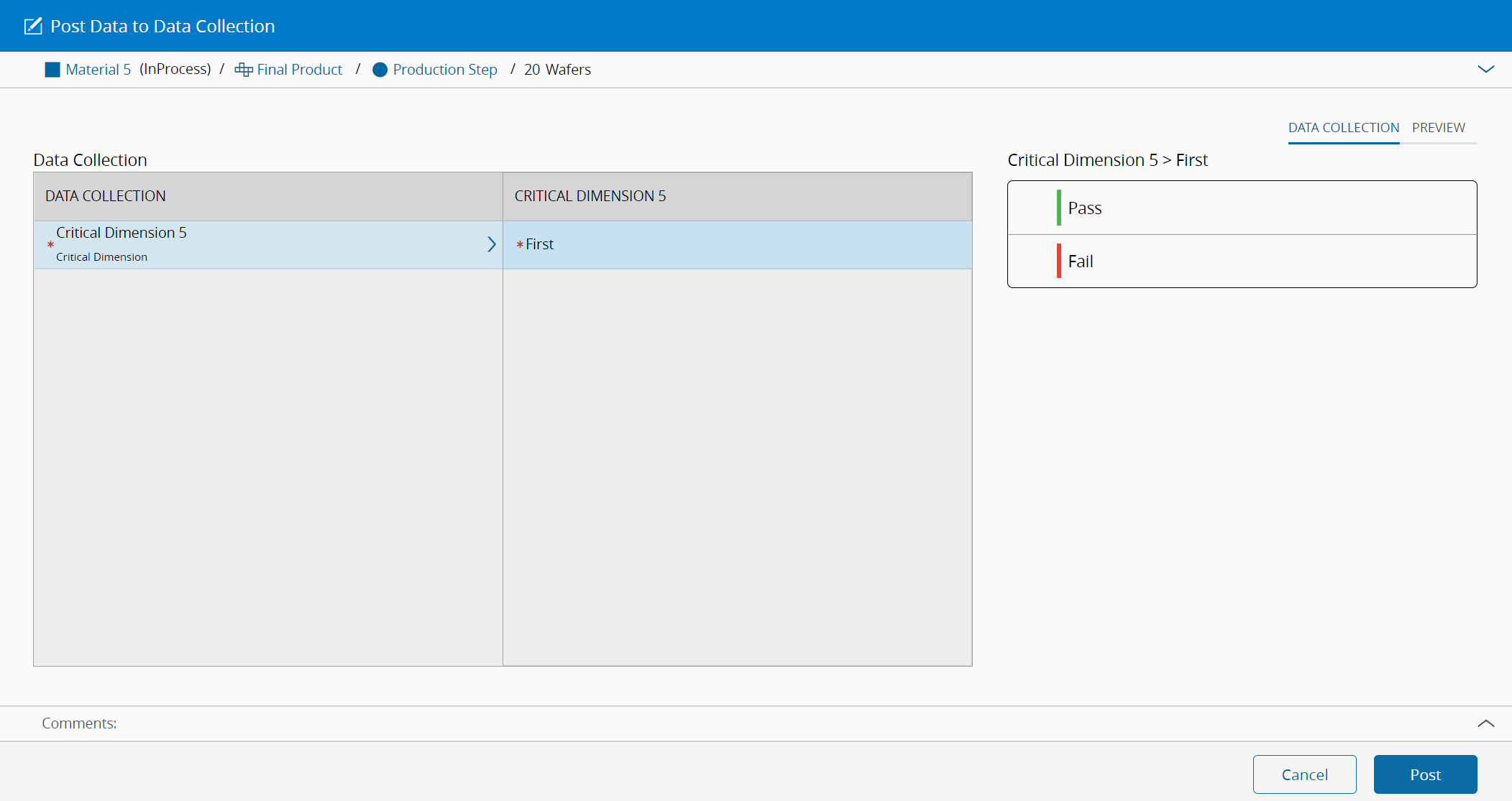 All the Inspection Order Steps require a Data Collection. Thus, to post a value for the Data Collection of the Material in the Inspection Order Step, you must access the Post Data to Collection Collection wizard available in the Material Details, Step, Resource, or Inspection Order Views. The Inspection Order view is displayed in the Figure below.