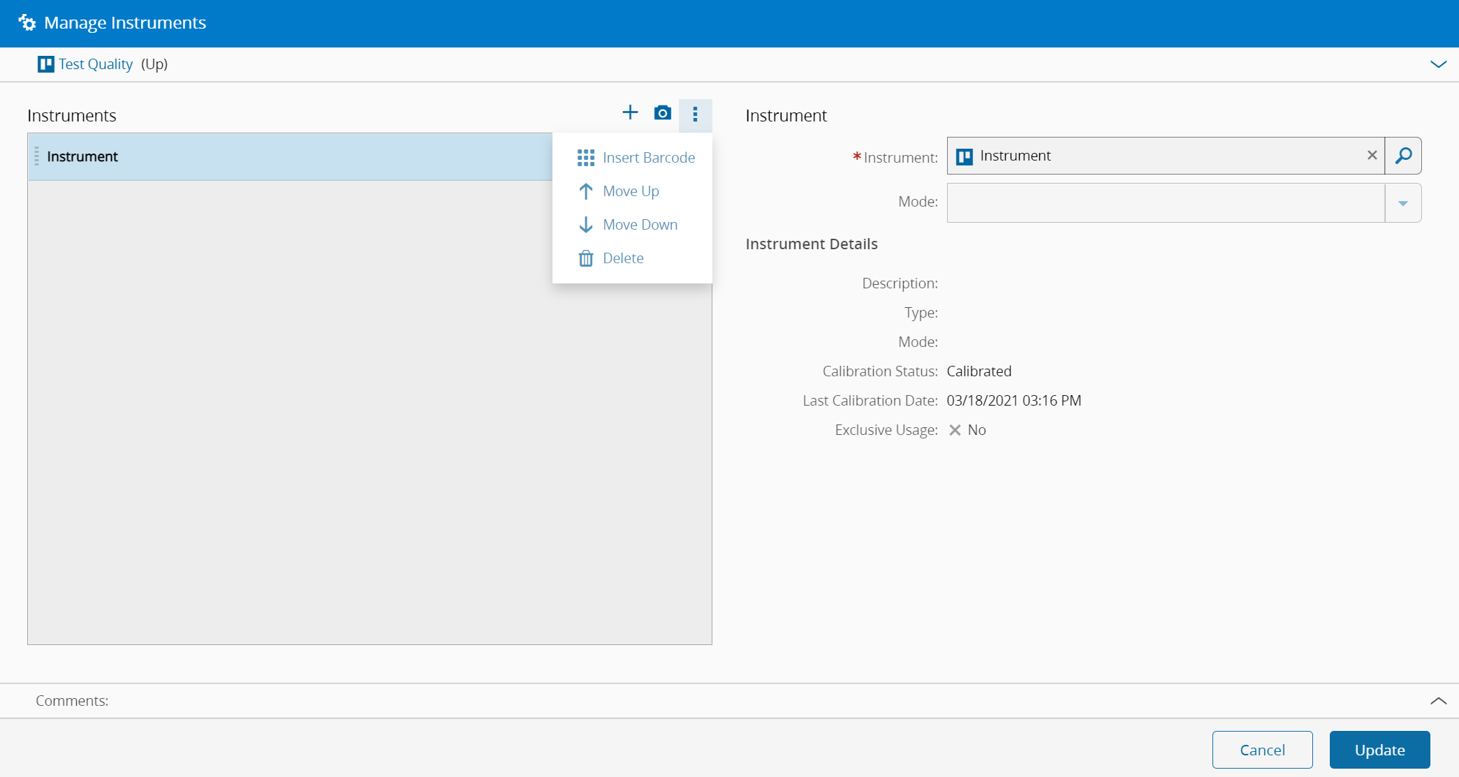 | Calibration Status | Defines the calibration status of the Instrument. The possible values are: - Calibrated - In Calibration - Not Calibrated |