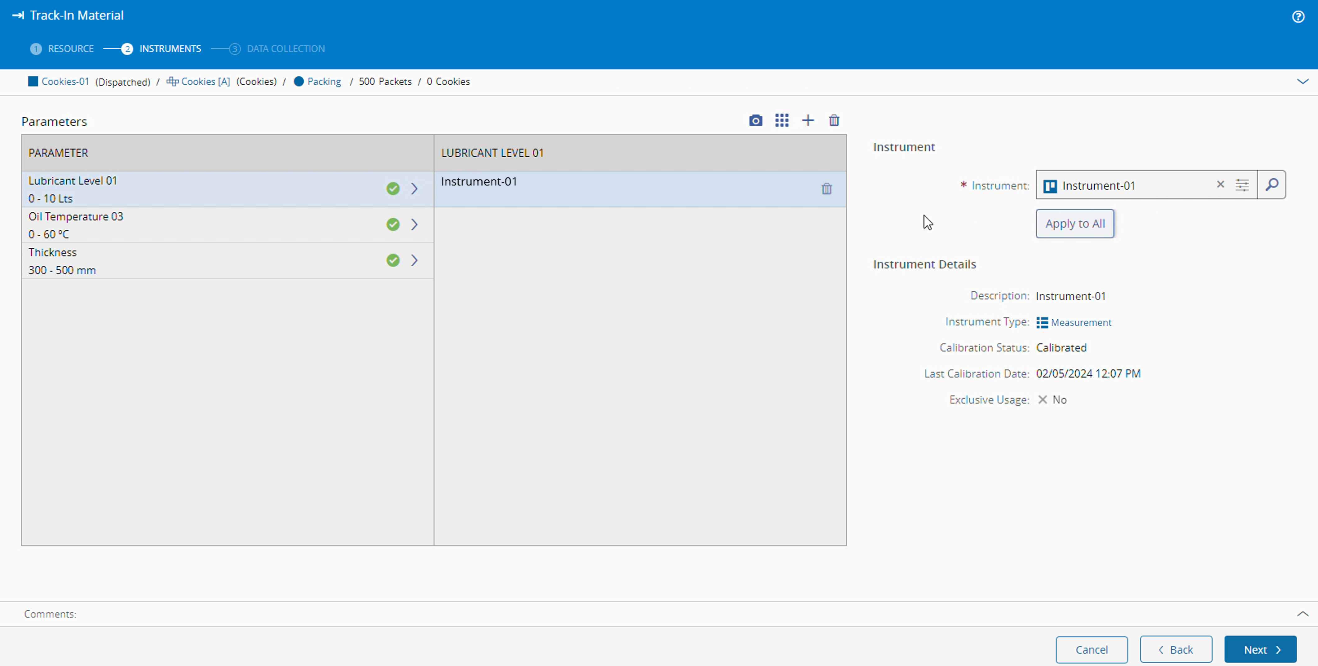 If the Step's property Require Instruments On Track-In is set to True, instruments that can measure the required Data Collection Parameters must be associated with the Resource. The Instrument Calibration Status must be set as Calibrated. Furthermore, if the Data Collection Parameter defines an Instrument Type, the Resource Instrument Type must match that Instrument Type.