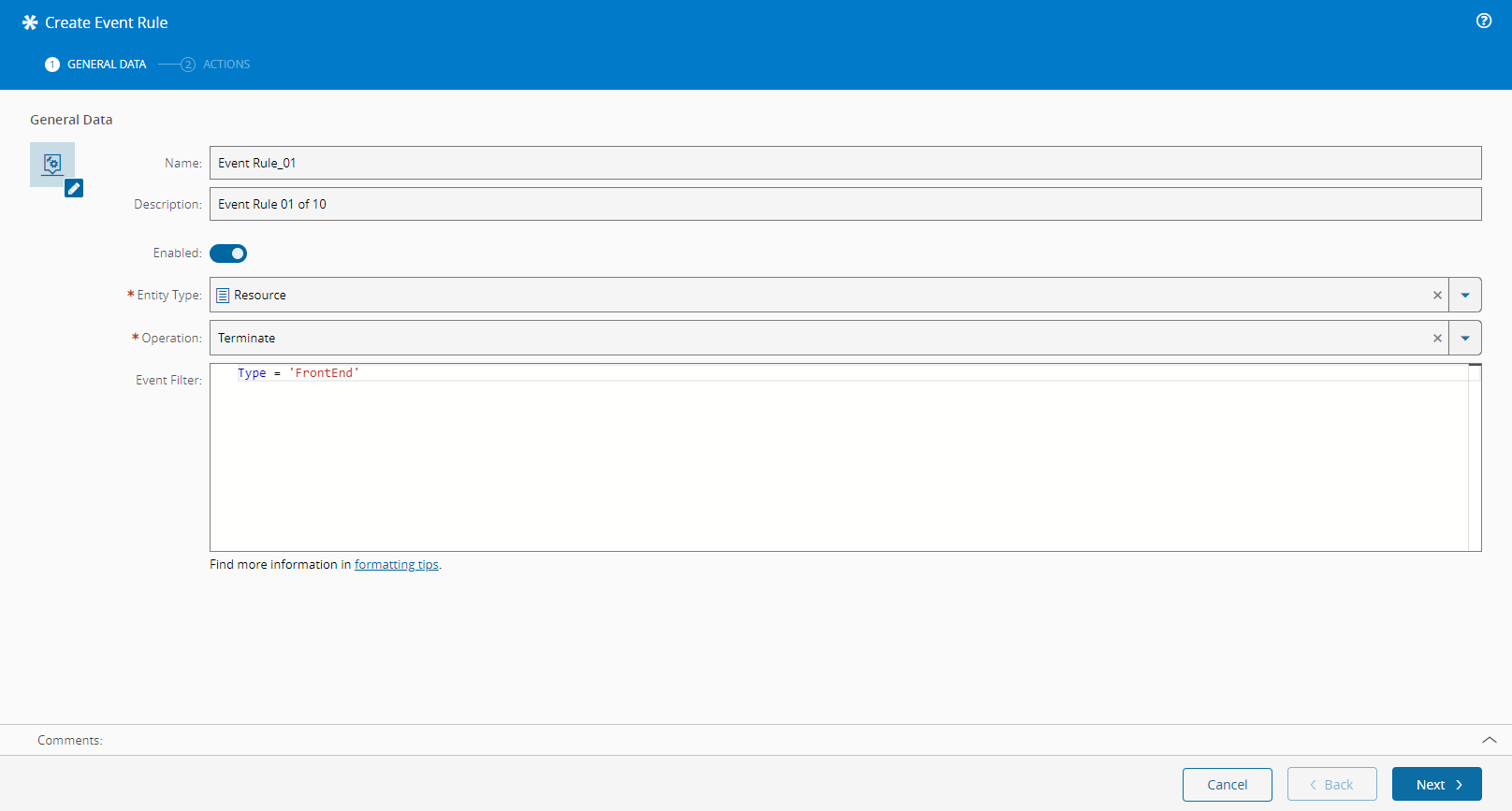 If you want to further specify the conditions when the rule must be executed, use the Event Filter, which will already be looking at the table of the selected Entity Type, to define additional filters using JSONata â§ expressions (link available on the page). The example below shows an Event Rule which is filtering resources that are being terminated, and are of the type