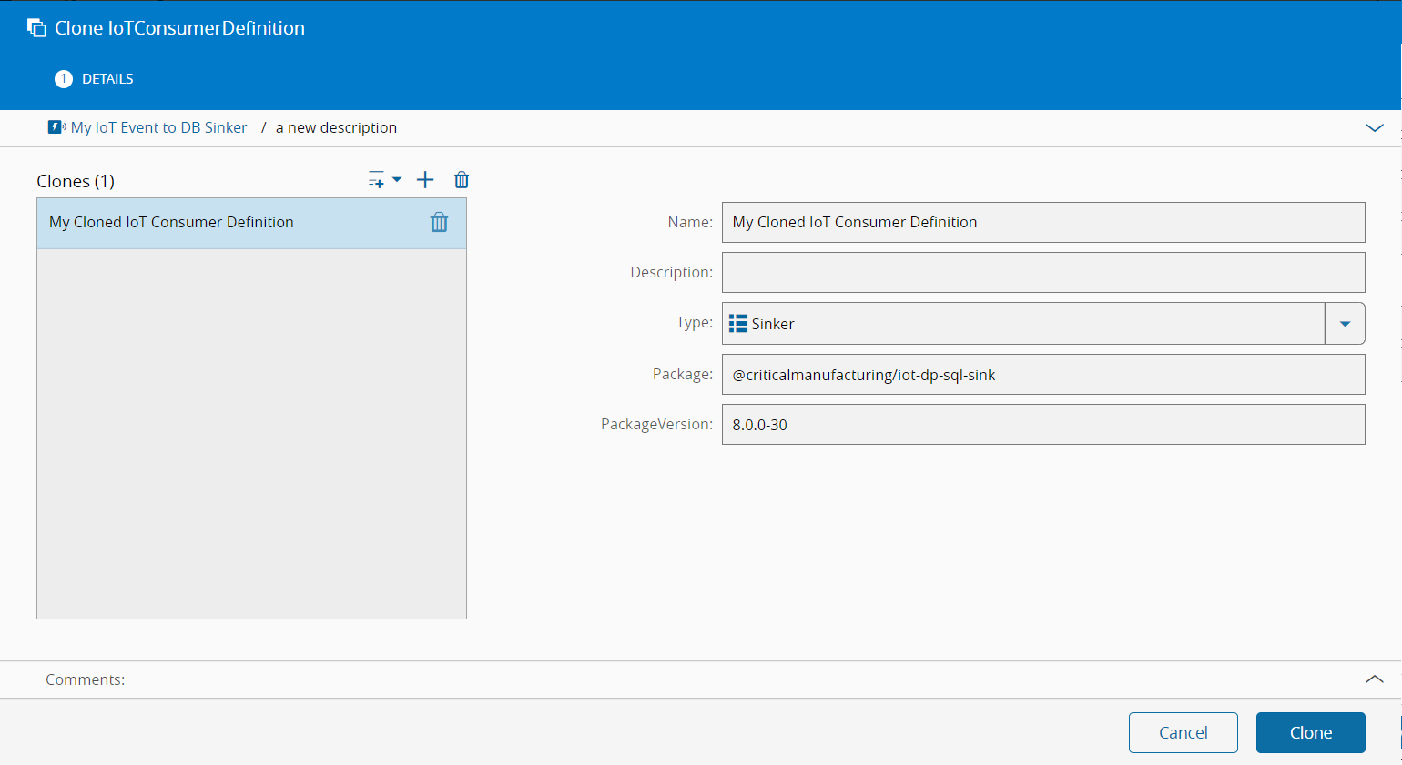 This operation is used to clone an existing IoT Consumer Definition into a new IoT Consumer Definition with a different name and identical characteristics.