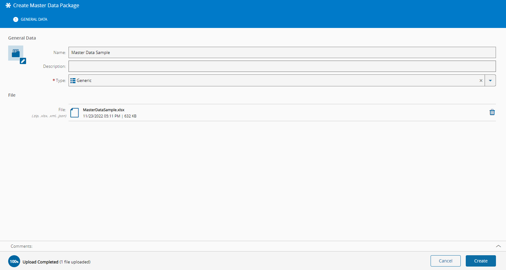 - Select Create to save the new Master Data Package.