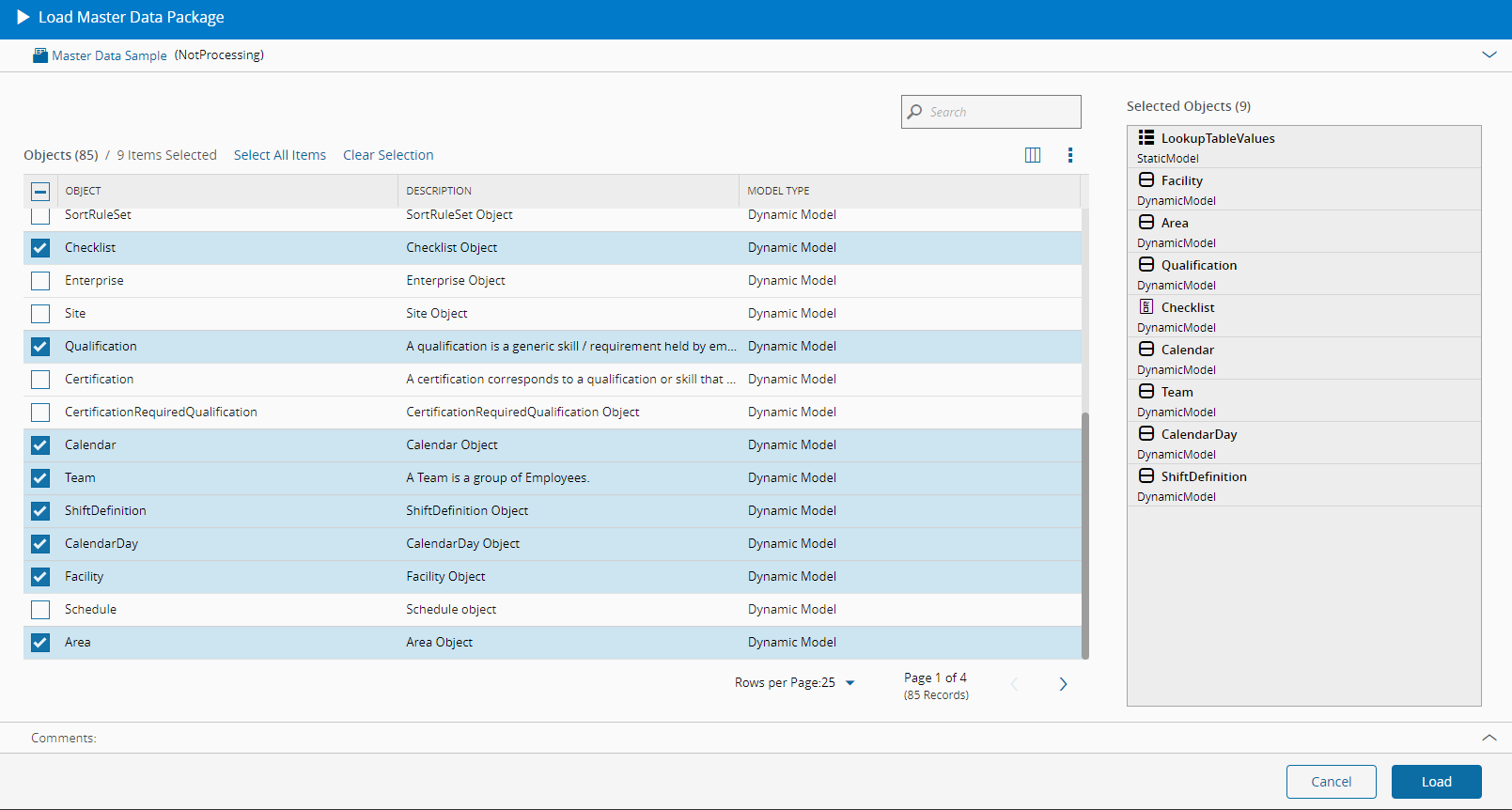 - The system will open a dialog where you can see the Entity Types available from the loaded package file. Select which of the entity types should be loaded into the Critical Manufacturing MES system and select Load to start the process.