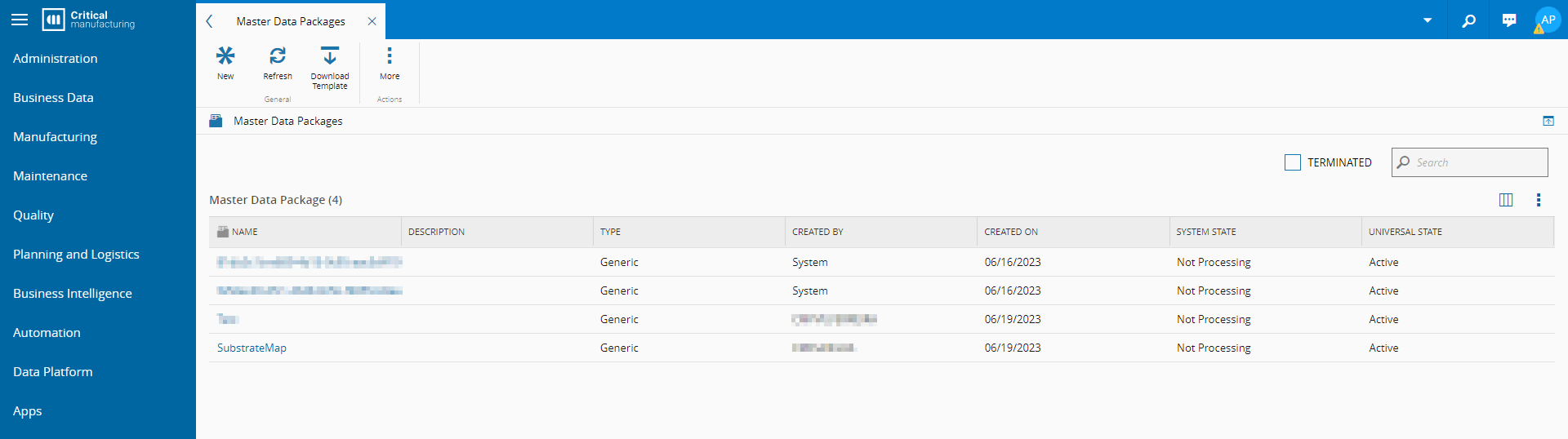 - Confirm the details and select Terminate to remove the Master Data Package.