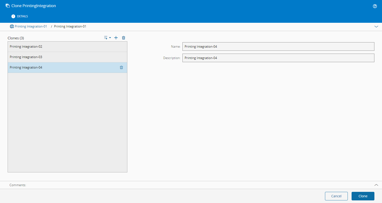 This operation is used to clone an existing Printing Integration.