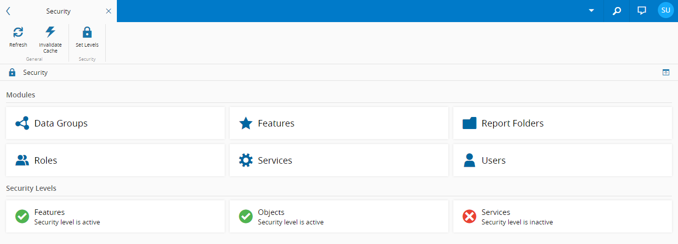 It's always possible to check the current active security levels by going to the Security page in Administration and taking a look at the bottom-left corner of the page as shown in the next picture. A red light indicates that the level is inactive whereas a green light indicate that the security level is active. Changing the current security levels can be done by selecting the Set Levels button in the top ribbon and setting the appropriate flags.
