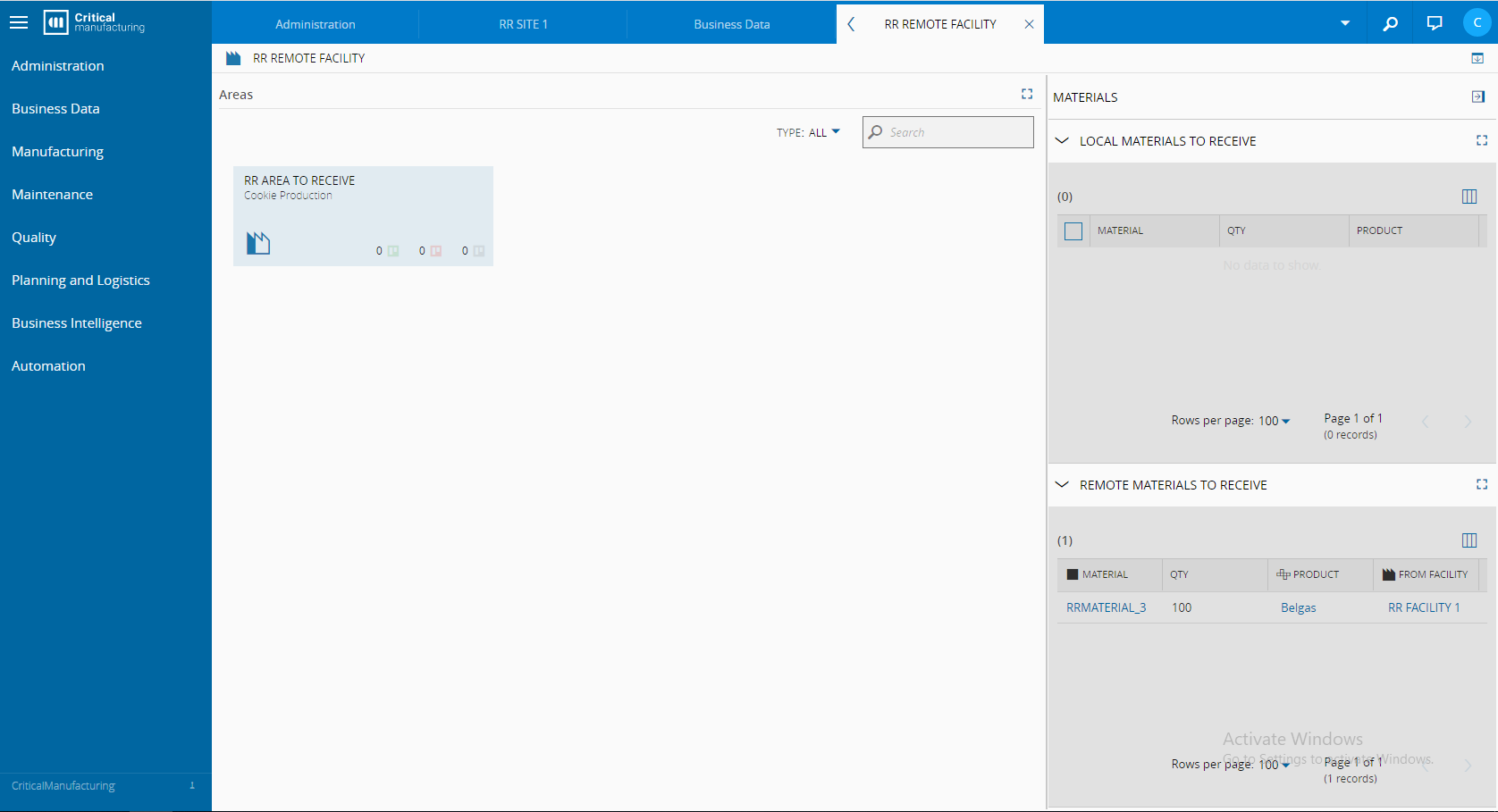 At the remote site, after the new integration entry is created, the user will have the pending Materials ready to be received in the Facility View Page.