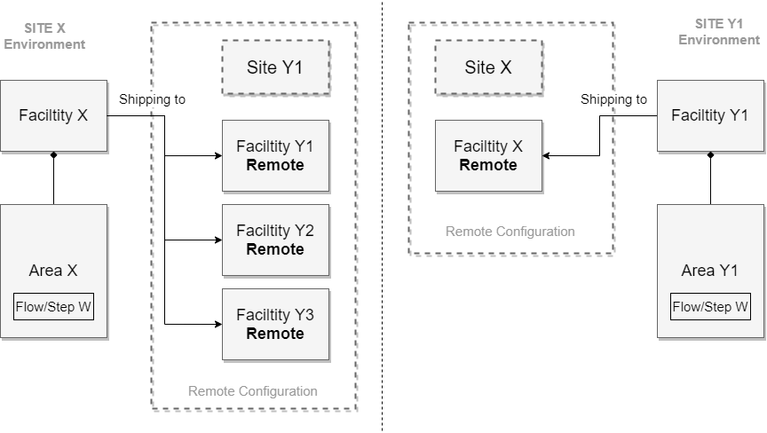To setup this integration scenario, all modeled objects must be represented in the system for it to work properly. Remote site mapping configuration is required for each site, as well as a remote Facility (which will be a local Facility on the remote site) and the same Flow and Steps.