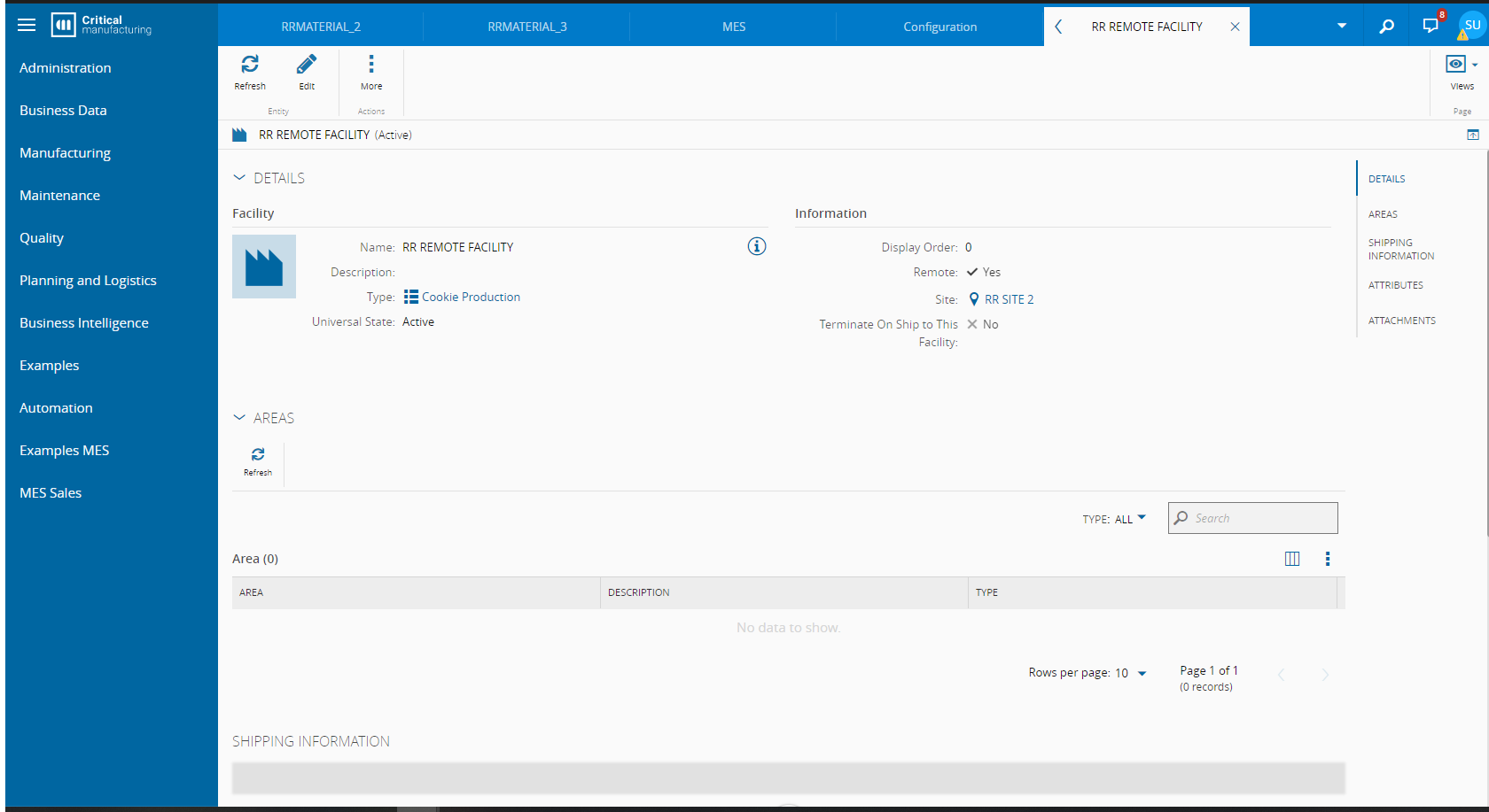 The remote site that will receive the Material should be configured in Critical Manufacturing MES system, with special attention to some mandatory fields: