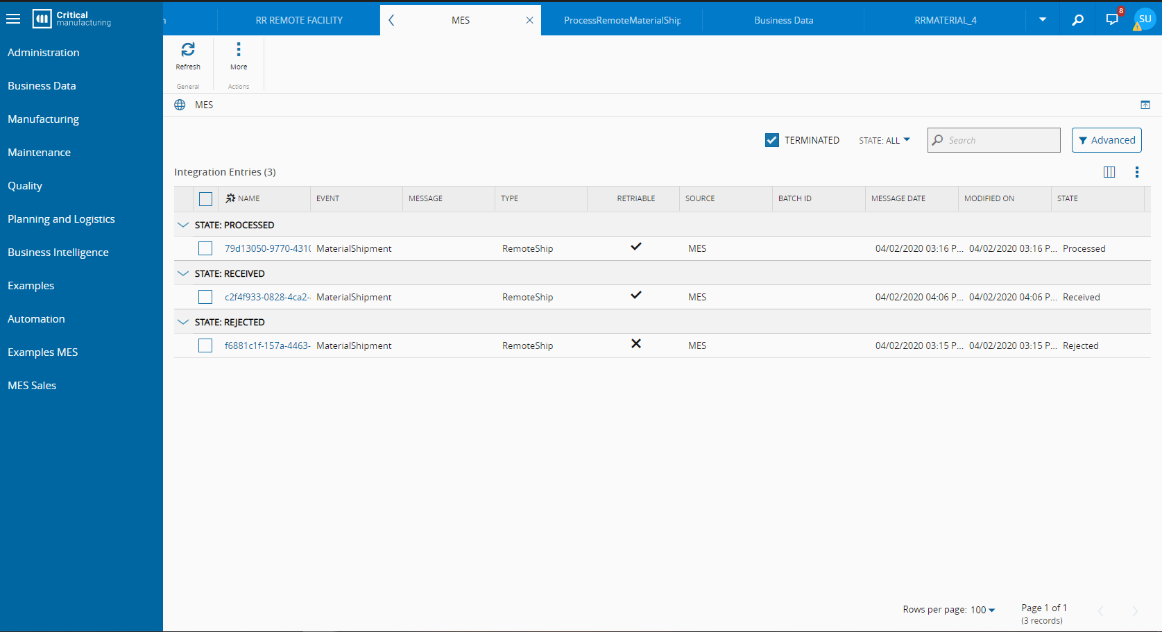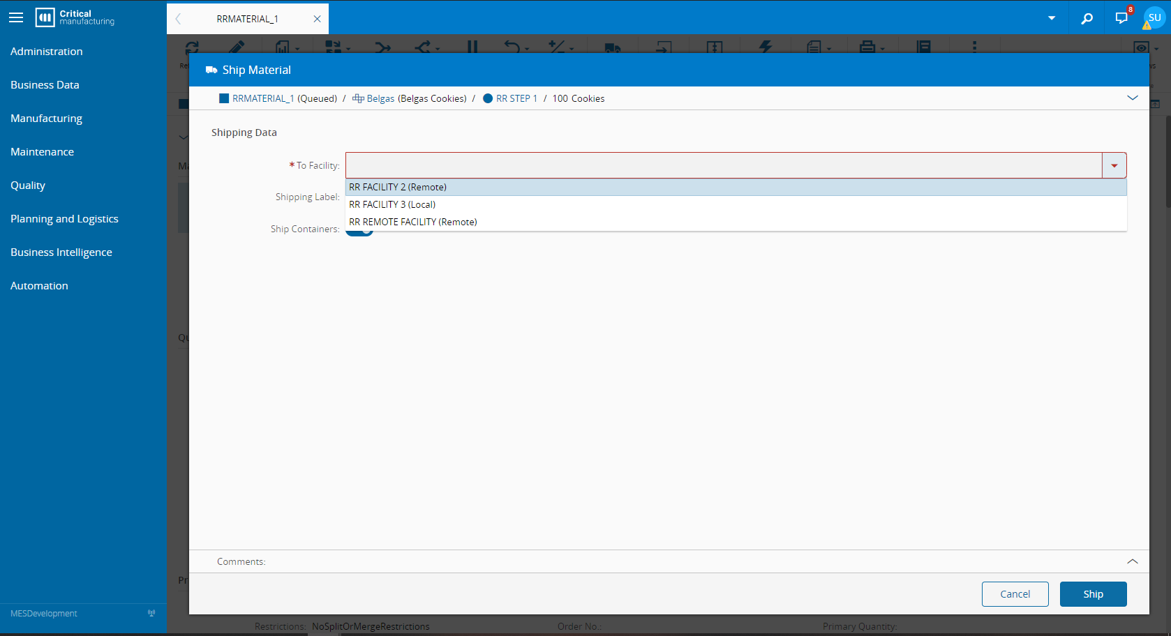 This integration package will be used for all integrations between Critical Manufacturing MES systems. For now, the product provides out-of-the-box Remote Material Shipment integration.