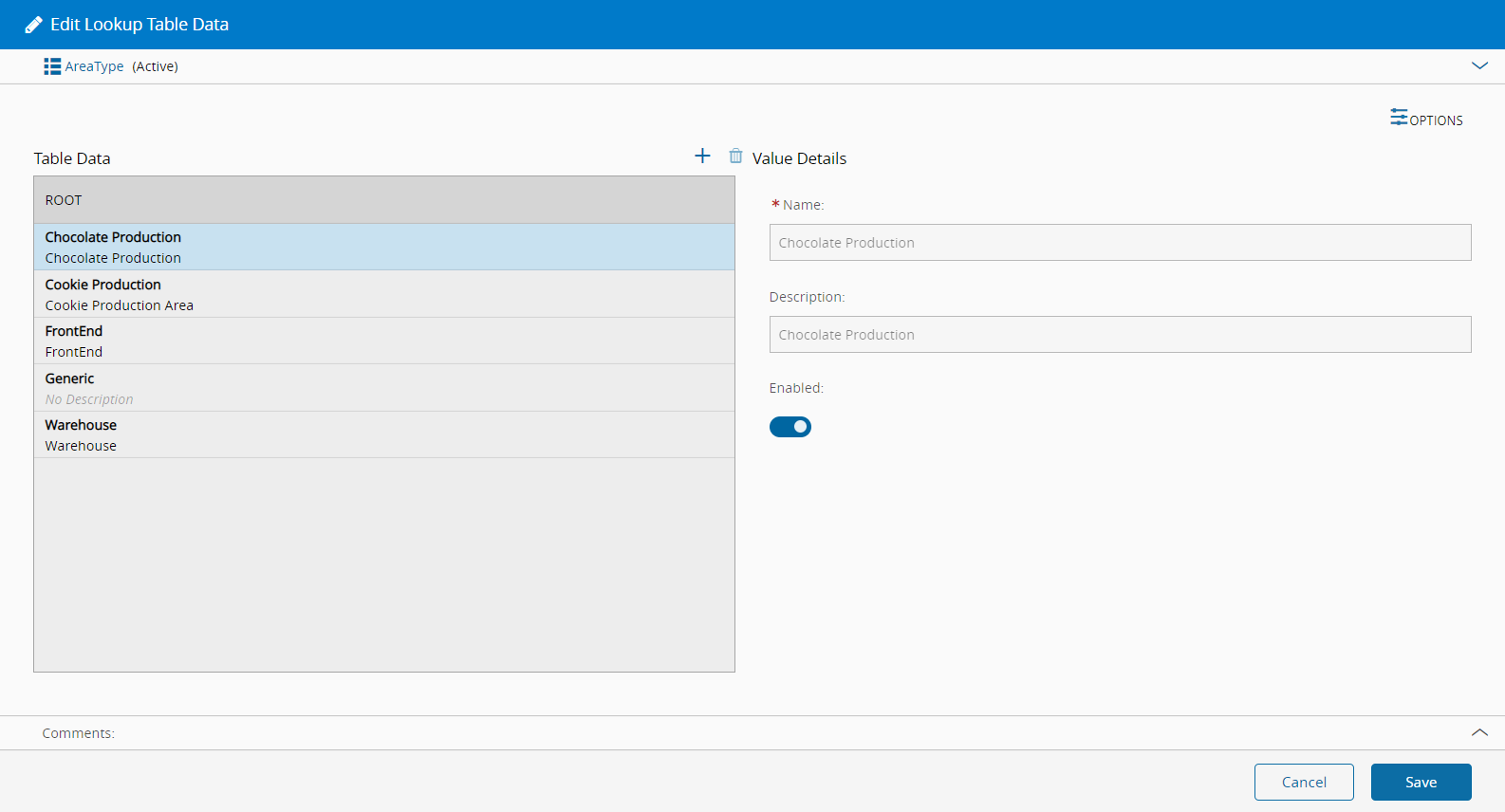 Lists all the data rows that are included in the Lookup Table. You can edit existing rows or add new ones.