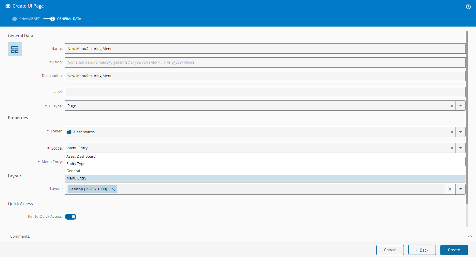Additionally, the Entity Type and Menu Entry scopes allows you to Pin To Quick Access: