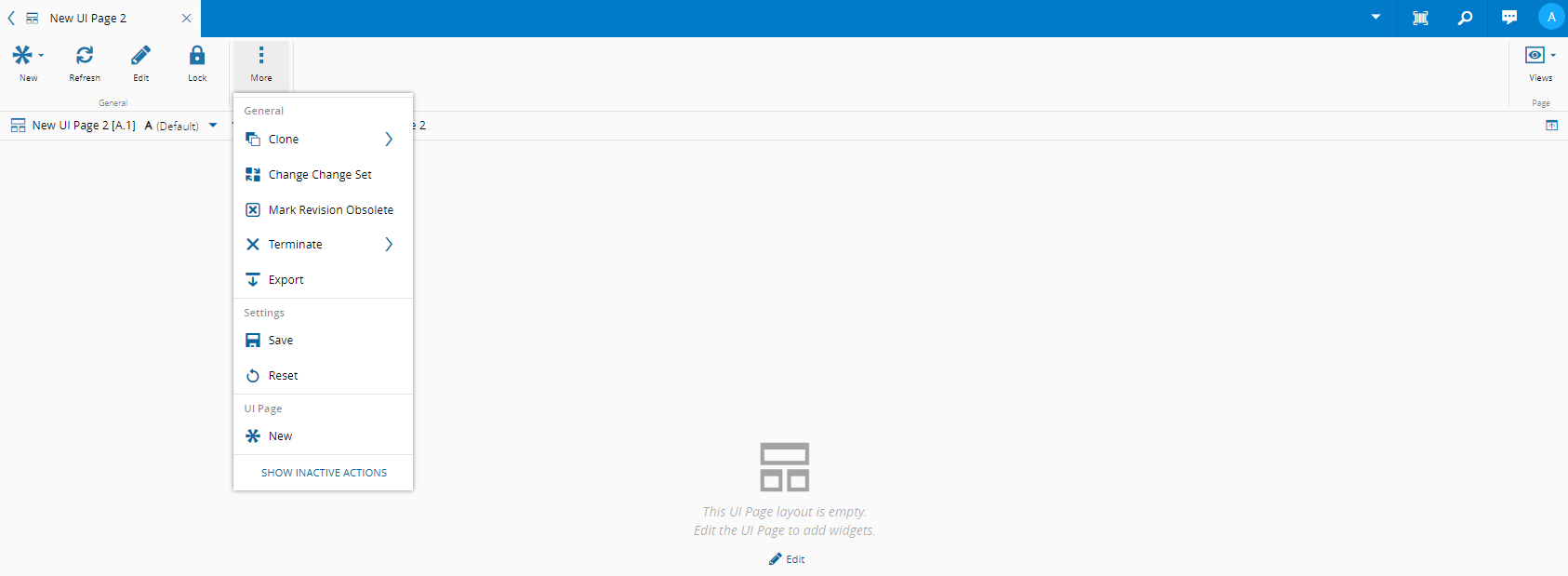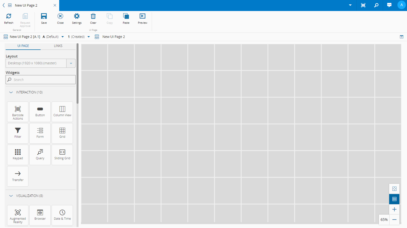 After successfully creating the UI Page, you can start designing your new UI Page by dragging and dropping the widgets on the left into the desired areas. For more information, see Design UI Page.