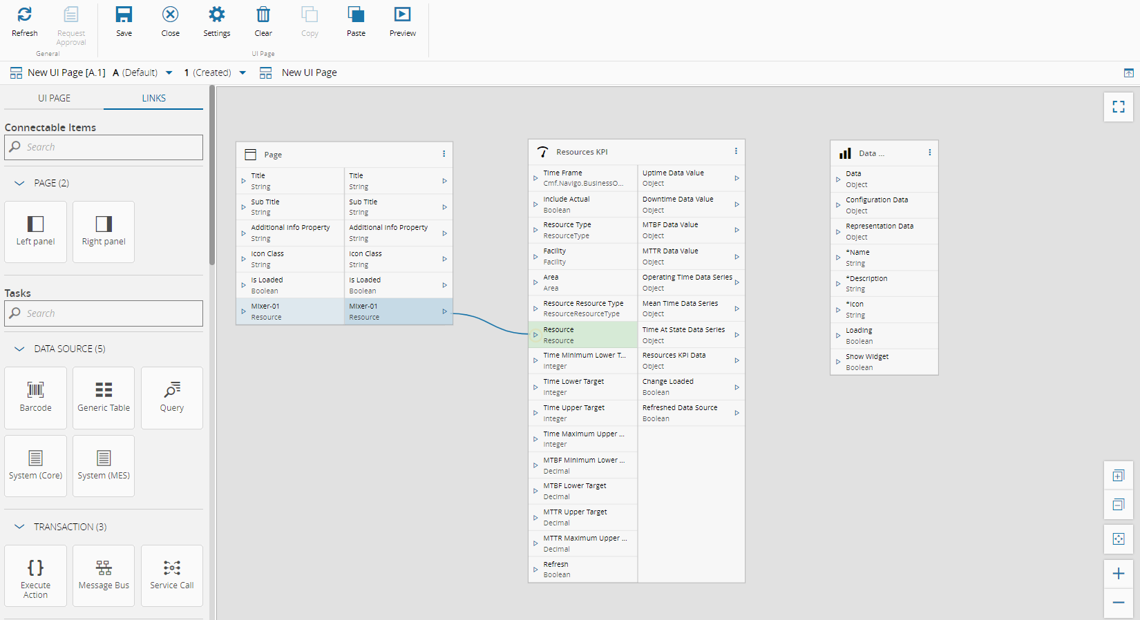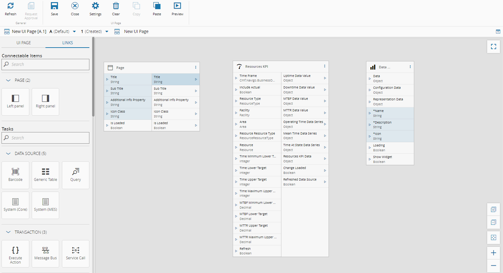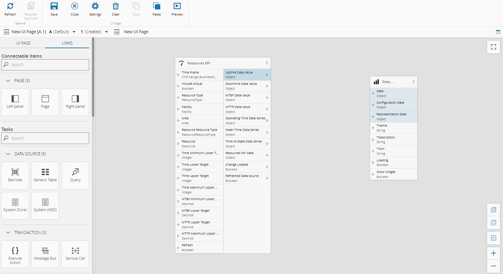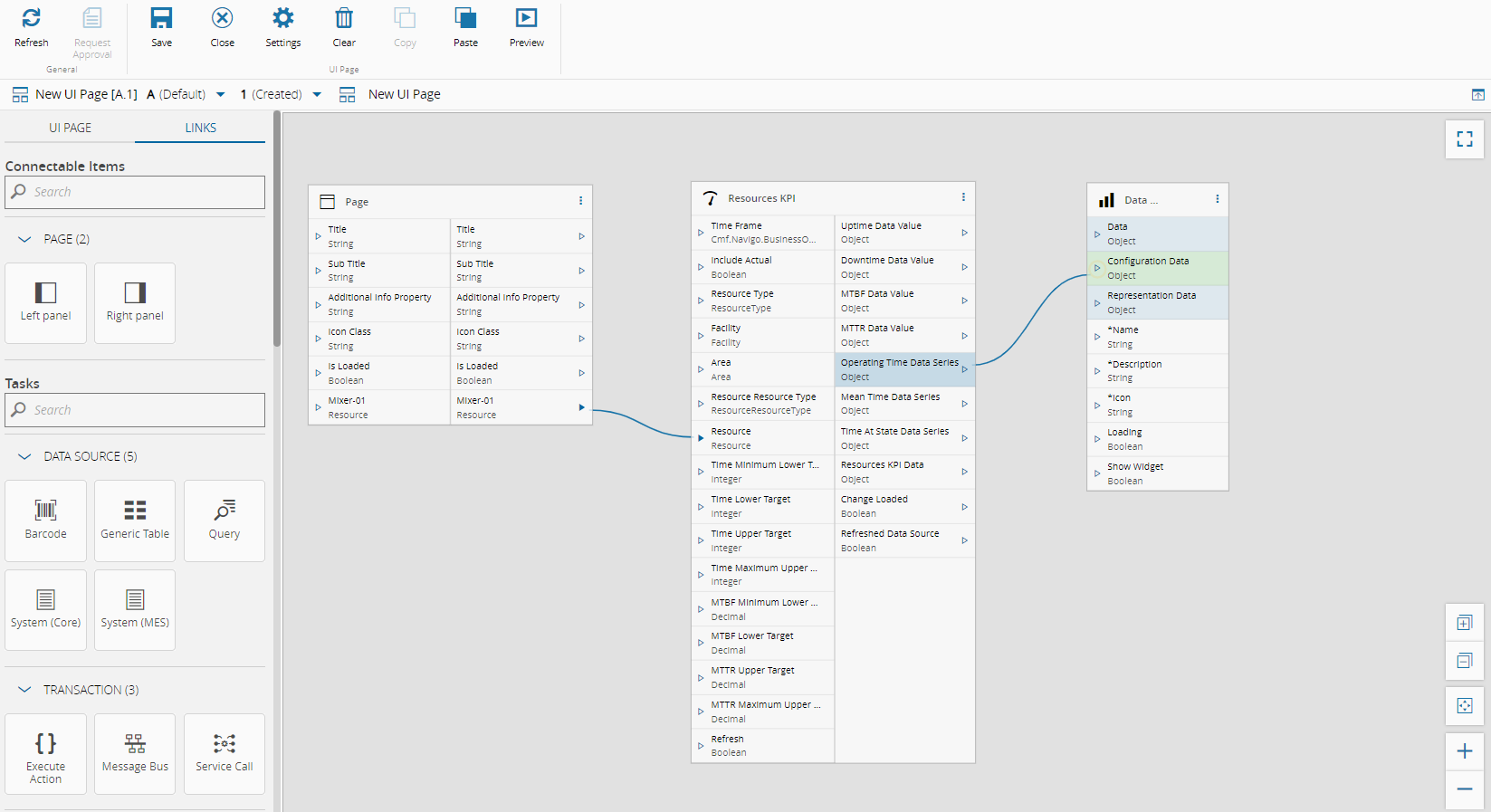 When you are in Edit Mode on a UI page, the Links tab provides access to the Links diagram view, where you can easily connect widgets and tasks. This mode also allows you to quickly check the necessary inputs and outputs for a given task or widget. Task outputs that can be directly connected with widget inputs are highlighted in blue. For example, the Uptime Data Value output of the Resource KPI task can be linked with the Data, Configuration Data, and Representation Data inputs of the Data Series widget. To connect any output with other non-highlighted inputs of the widget, a converter is required. For more information, see UI Page Converters.