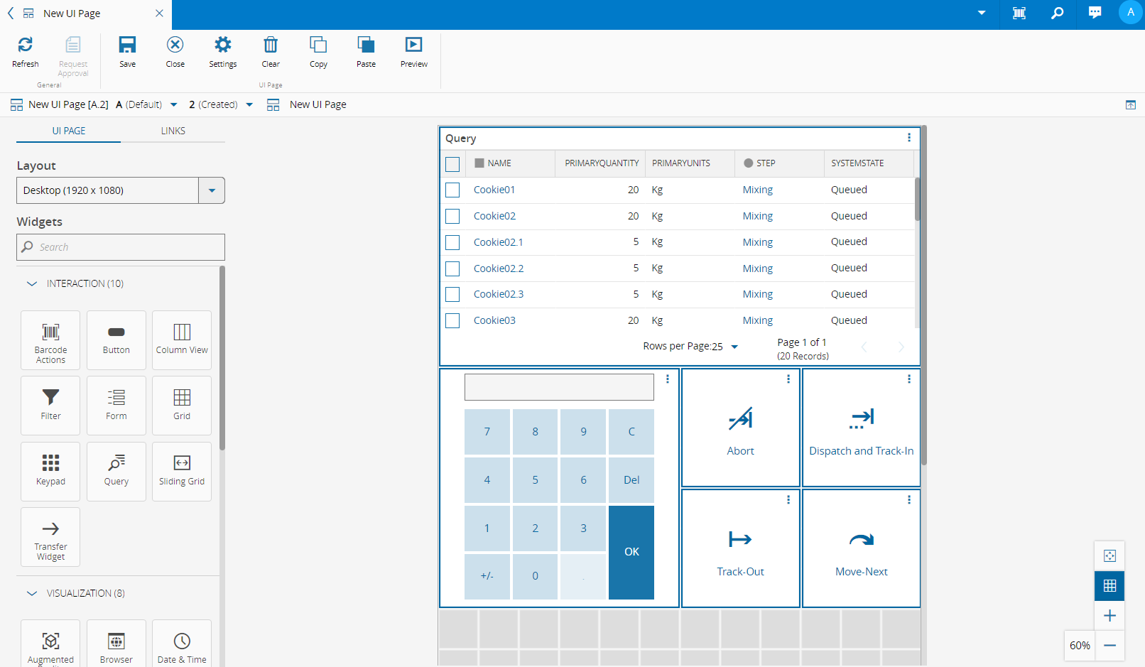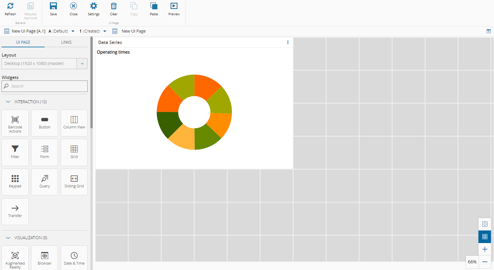 Populate the page by dragging and dropping widgets from the left-side panel into the desired areas. Use the and buttons to zoom in and out on the UI Page. To fit the entire UI Page to your viewport, select the button. You can toggle the grid view with the button.