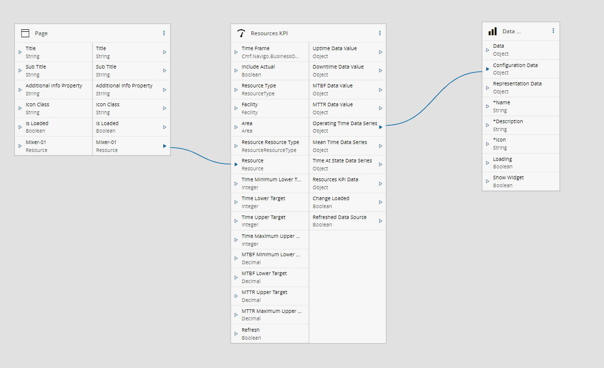 Similarly, you can connect the Operating Time Data Series output of the Resources KPI task with the Configuration Data input of the Data Series widget directly in the Links diagram or through the Settings wizard of the widget or the task, as shown below.