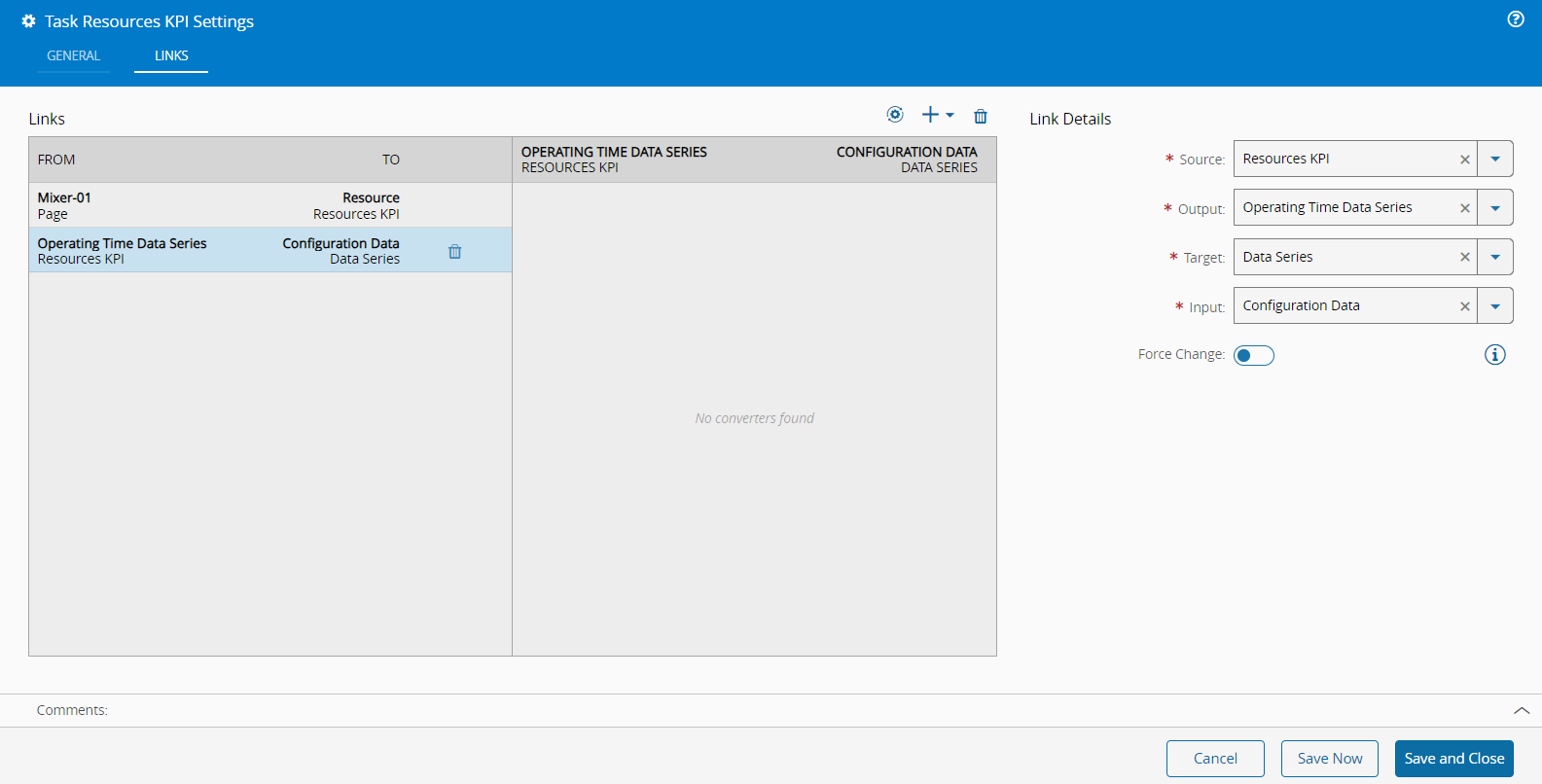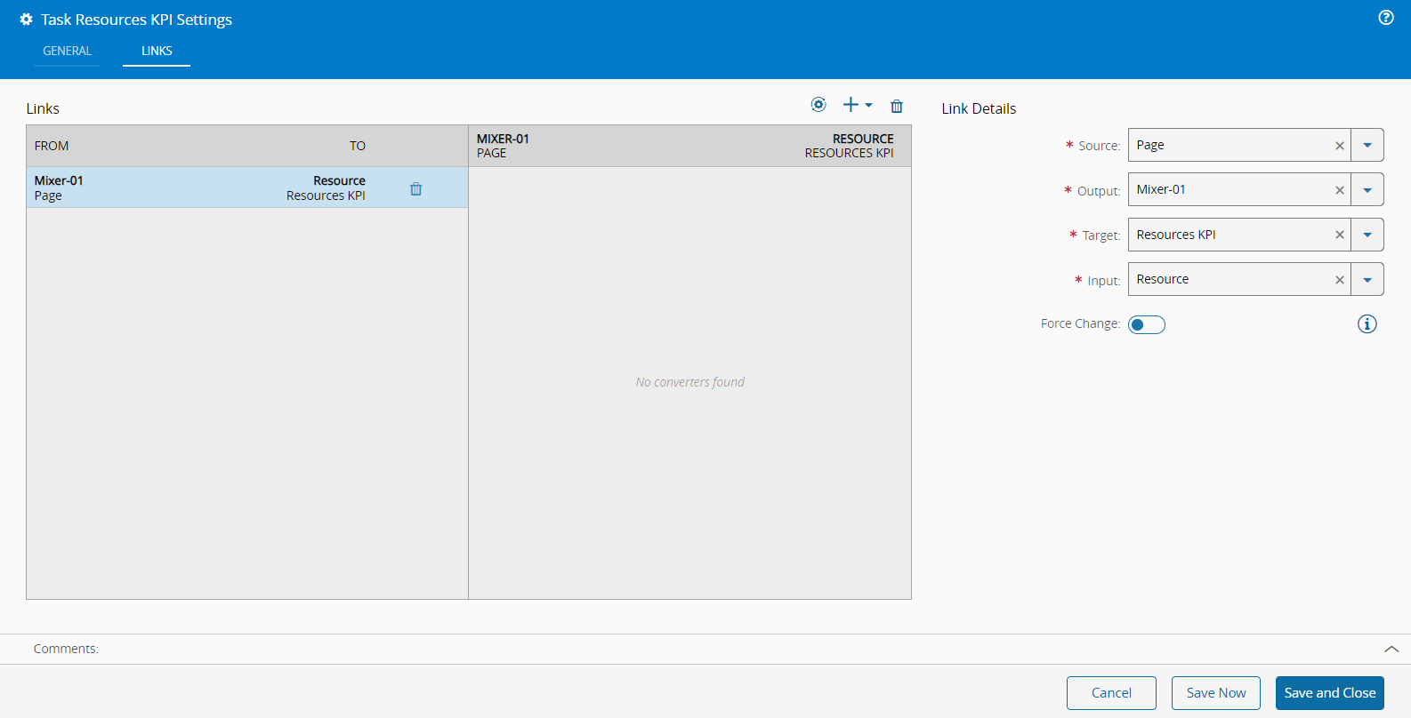 You can then connect the Resource Entity Type, Mixer-01, with the Resource input of the Resources KPI task directly in the Links diagram. Alternatively, you can access the Resources KPI task wizard and use the Links tab to configure the same behavior.